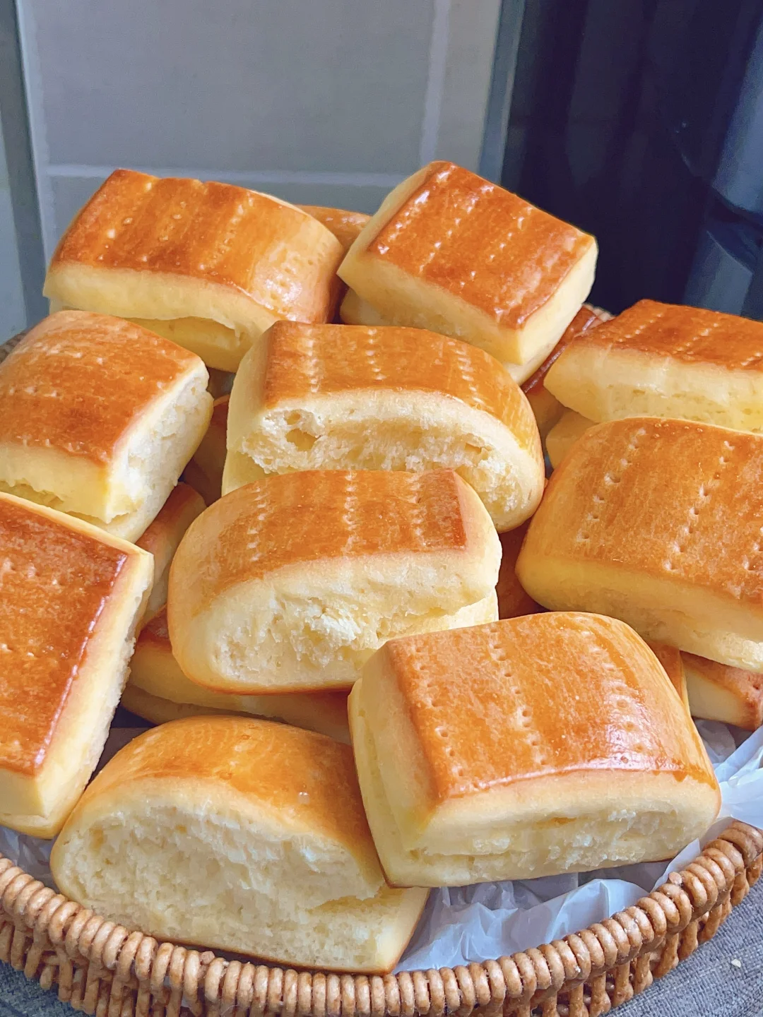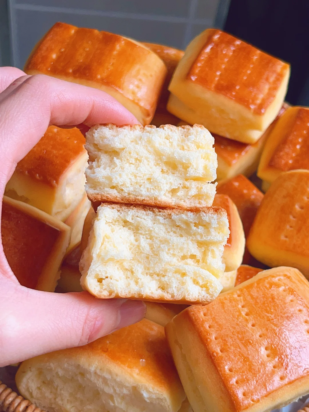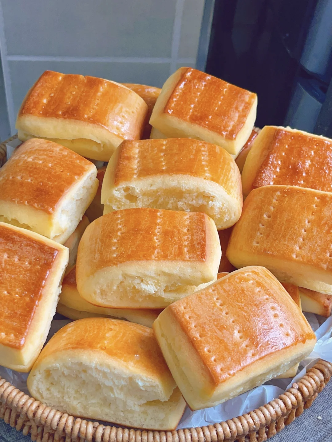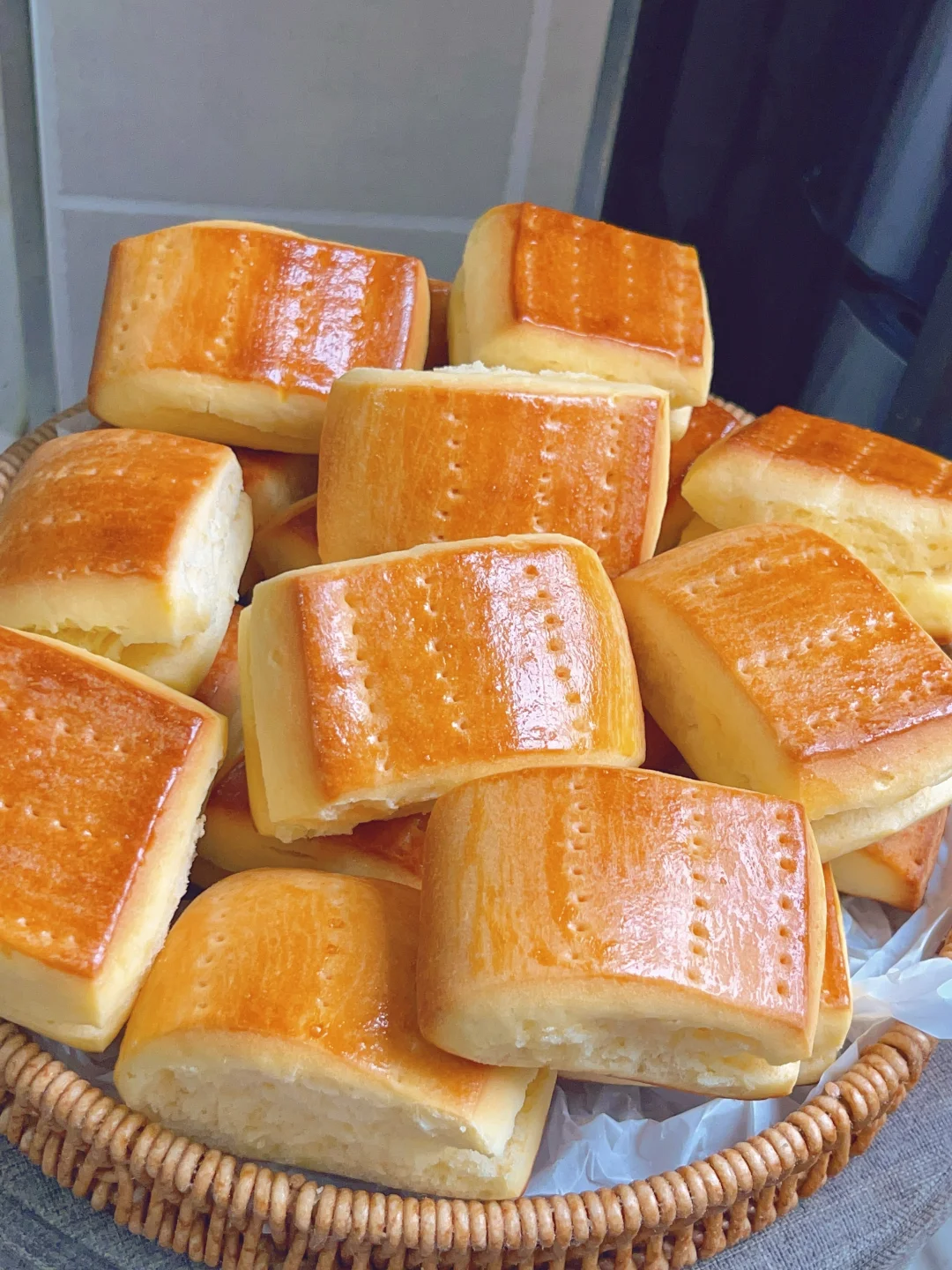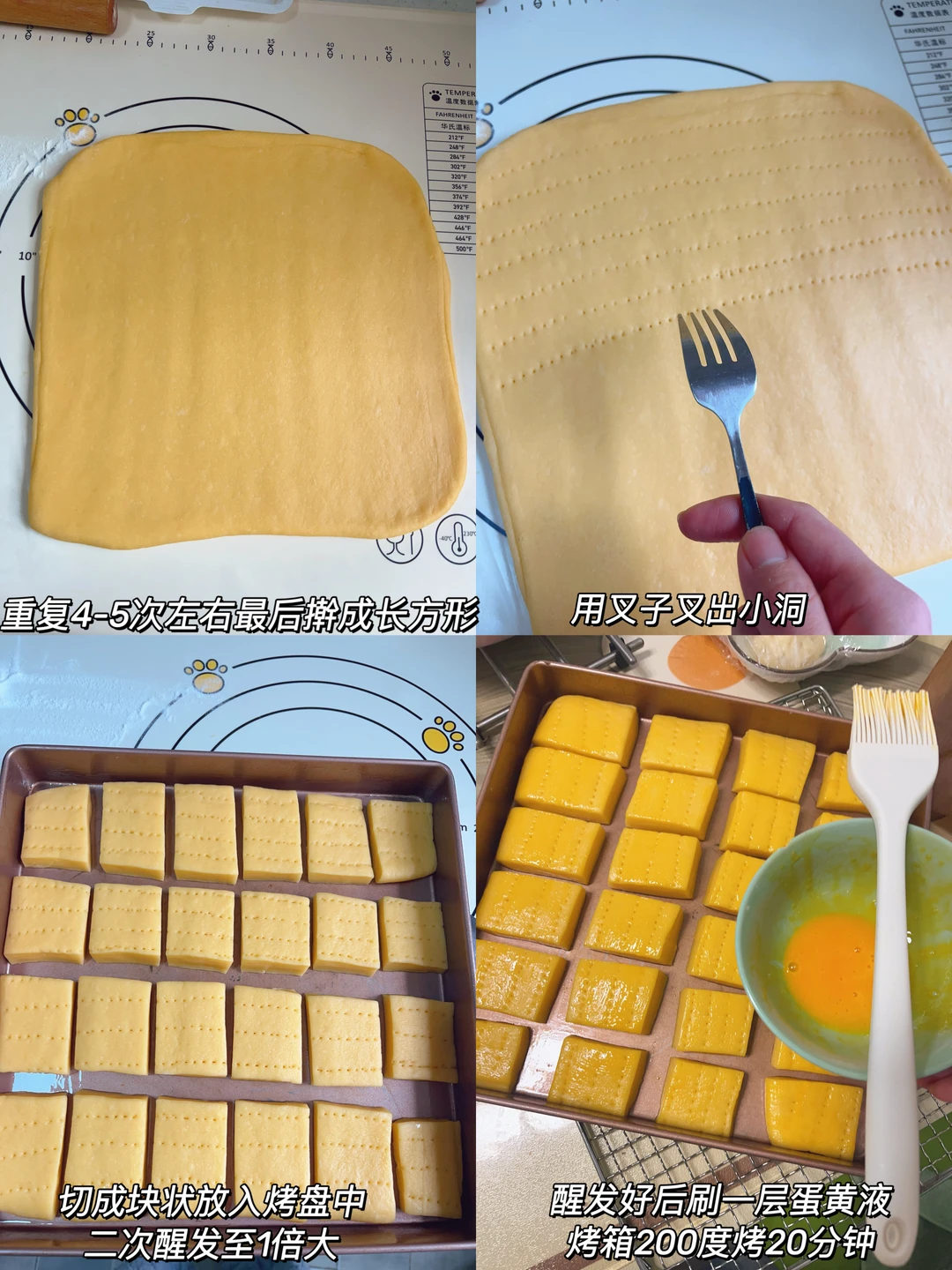 这个棋子饼真的好香好香,食材简单做法简单松松软软真的巨好吃! [清单R]食材 3个鸡蛋、5g耐高糖酵母、60g牛奶、500g面粉、70g玉米油 [清单R]步骤 1⃣️盆中打入3个鸡蛋5g酵母60g牛奶先搅拌均匀 2⃣️然后加入500g面粉70g玉米油揉成面团,面团醒发至1倍大 3⃣️醒好的面团擀成长方形,上下往里折叠然后再次擀成长方形,重复做4-5次,最后擀成和烤盘差不多大小的长方形 4⃣️用叉子在面皮上叉一些洞,切成块状放在烤盘中醒发至1倍大 5⃣️醒发好后刷一层蛋黄液,烤箱200度烤20分钟