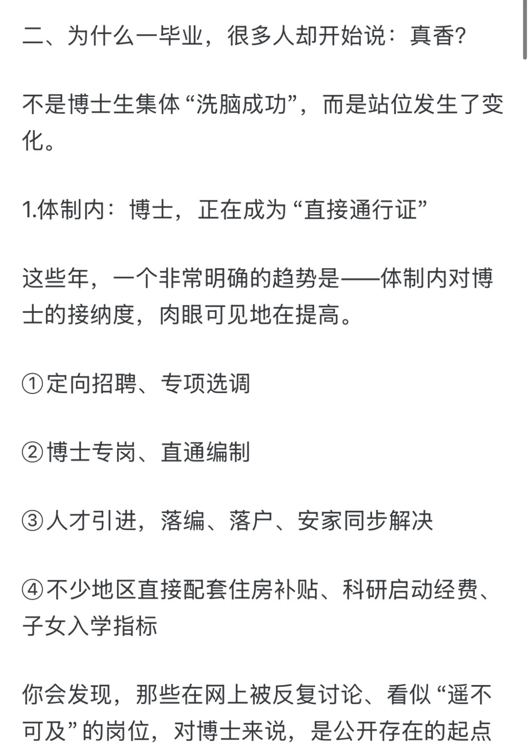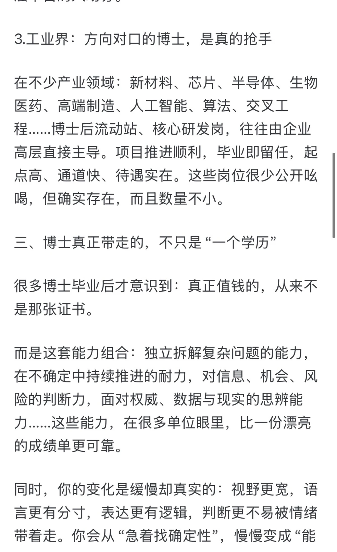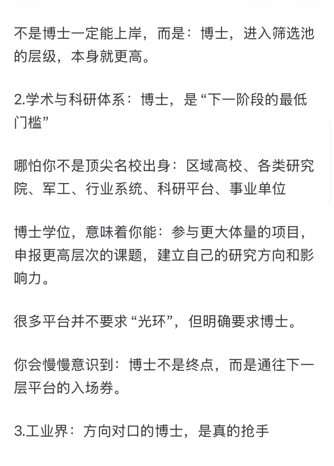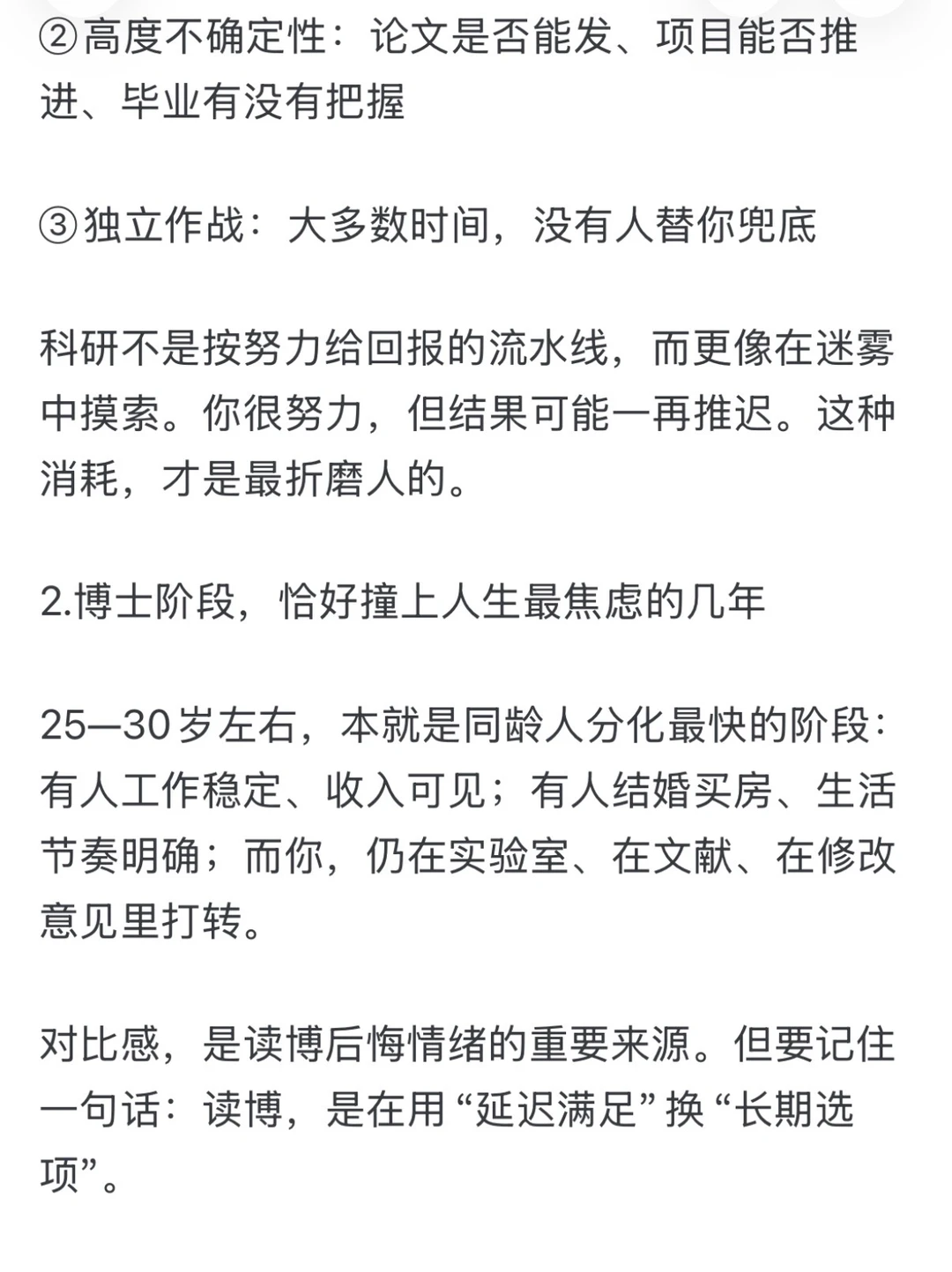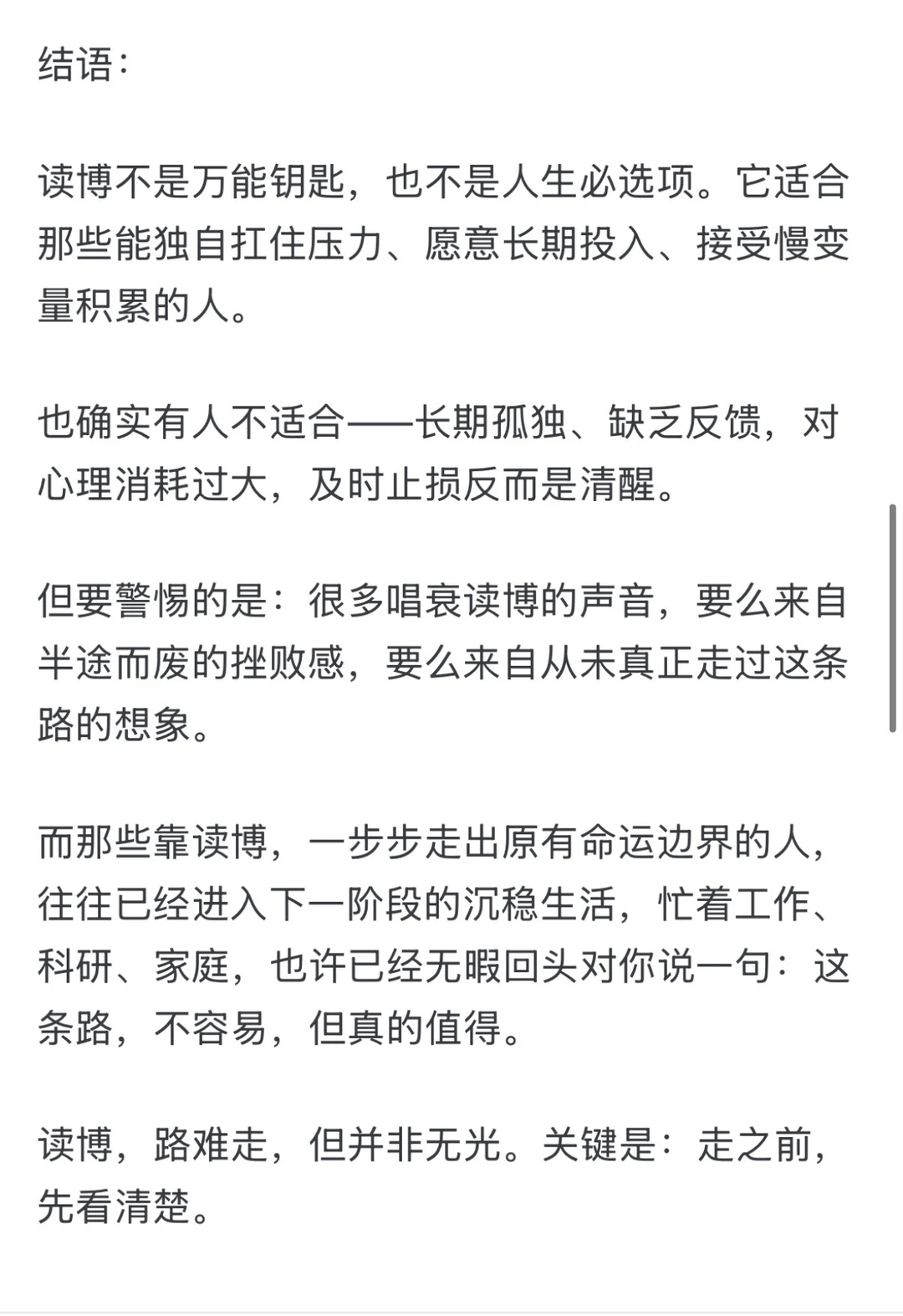 结语: 读博不是万能钥匙,也不是人生必选项。它适合那些能独自扛住压力、愿意长期投入、接受慢变量积累的人。 也确实有人不适合—长期孤独、缺乏反馈,对心理消耗过大,及时止损反而是清醒。 但要警惕的是:很多唱衰读博的声音,要么来自半途而废的挫败感,要么来自从未真正走过这条路的想象。 而那些靠读博,一步步走出原有命运边界的人,往往已经进入下一阶段的沉稳生活,忙着工作、科研、家庭,也许已经无暇回头对你说一句:这条路,不容易,但真的值得。 读博,路难走,但并非无光。关键是:走之前,先看清楚。