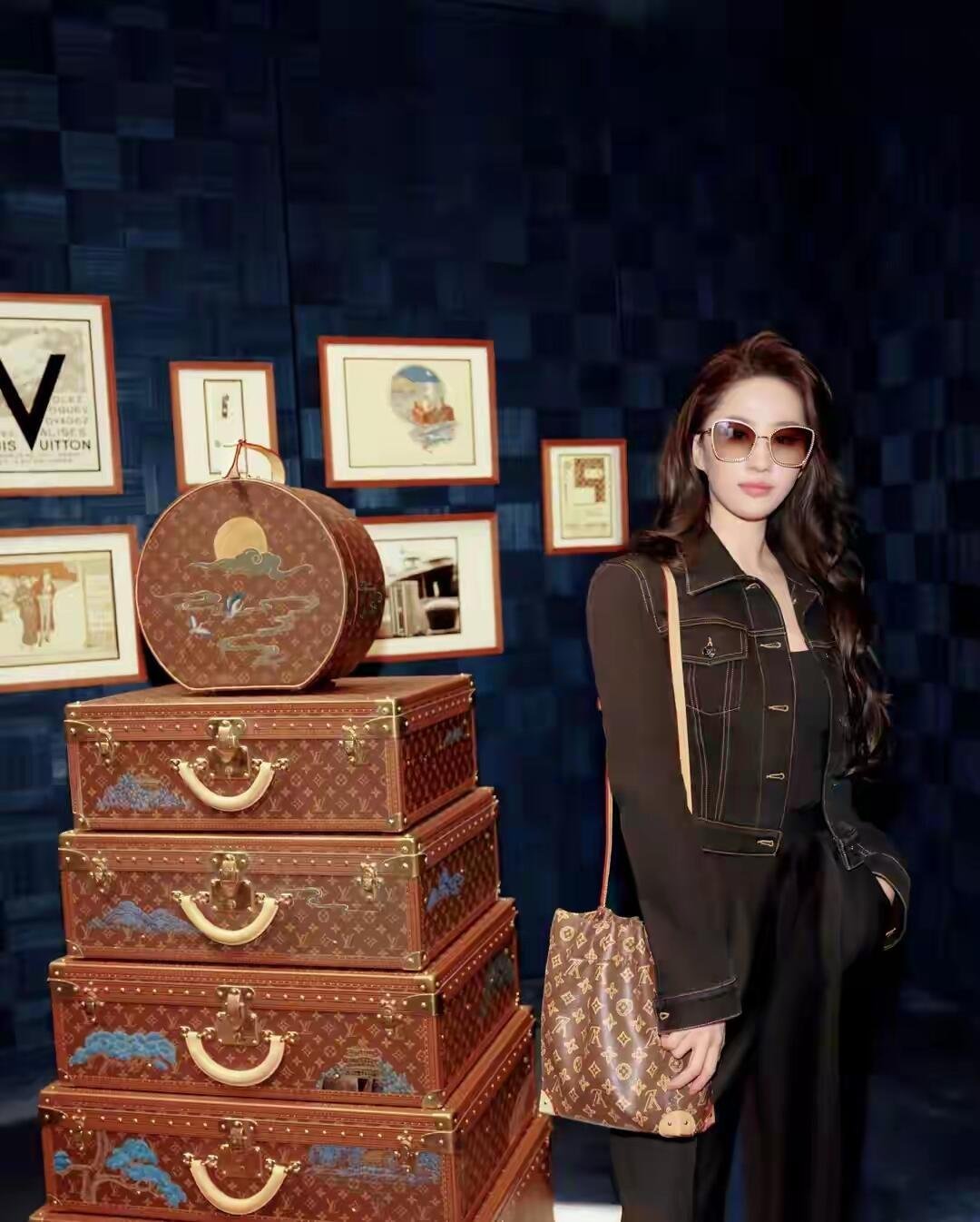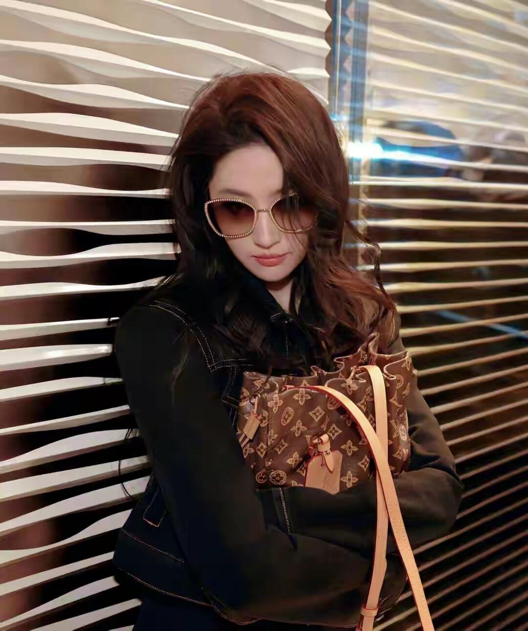 刘亦菲黑色牛仔套装,白色锁边添了一抹俏皮,搭配红色帽子更显灵动。