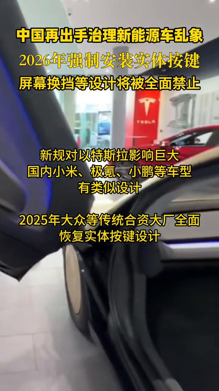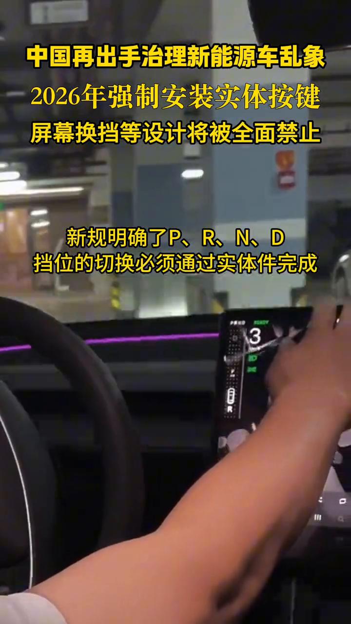 中国再出手治理新能源车乱象,2026年强制安装实体按键,屏幕换挡等设计将被全面禁止。 从单踏板模式开始,到全隐藏式门把手,再到屏幕换挡、取消实体按键,直至"全自动驾驶"被美法院控欺诈。曾经代表技术风向标的所谓创新设计,如今都成为安全隐患。 工信部新规严禁"纯屏幕换挡"设计,在基础的灯光控制上,涉及应急安全的雨刮、紧急呼叫(AECS)、电动车断电开关等也必须具备实体按键。实体按键包括四个方面: ·1.灯光类:转向灯、危险警告灯(双闪)、喇叭。 ·2.挡位类包括:P/R/N/D挡(禁止纯屏幕换挡)。 ·3.组合驾驶辅助系统(智驾)激活开关。 ·4.安全/应急类:雨刮、除霜除雾、车窗升降、紧急呼叫(AECS)、电动车断电开关。 新规将于2026年7月1日实施,汽车关键功能必须配备实体按键。车辆物理键的有效操作面积不小于10x10mm,必须具备固定的操作位置,支持盲操,并能提供明确的触觉或听觉反馈。 工信部新规要求对已经售出的车型无需进行整改,后续准入车型将面临整改。新规对以特斯拉影响巨大,国内小米、极氪、小鹏等车型有类似设计。2025年大众等传统合资大厂全面恢复实体按键设计。欧盟新车安全评鉴协会(Euro NCAP)也正式实施驾驶员控制界面新规,要求转向灯、雨刮器等5项关键安全功能必须通过实体按键/拨杆操作,禁止仅依赖触屏。 从单踏板模式开始,到全隐藏式门把手,再到屏幕换挡、取消实体按键,直至"全自动驾驶"被美法院控欺诈。曾经代表技术风向标的所谓创新设计,如今都成为安全隐患。
