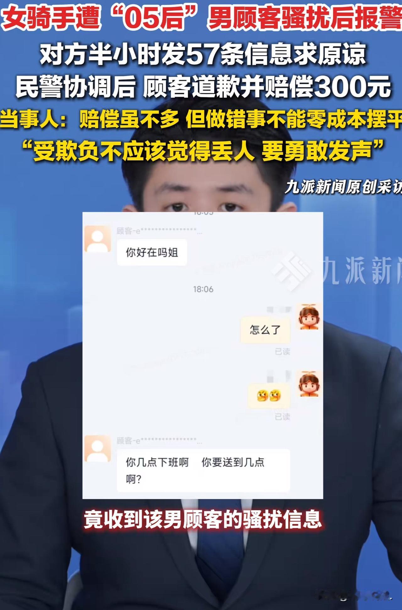 上海,“00”后女子做外卖员,一日,女子送餐给一“05”后男子派完单后,女子竟收到男子的骚扰信息。对方说,给女子200元钱,让女子陪他一次。女子非常气愤,说要报警。男子怕了,半个小时内,竟给女子发了57条信息求原谅:姐给你钱行吗,还是给你跪下,怎么样你才能原谅我?女子又烦又气,因精神不集中,差点没撞车。女子一气之下,报了警,民警调解后,男子向女子道歉,并赔偿300元钱。 最近,上海一位00后外卖女骑手小葛,就遇到了一件特别让人恶心的事。 只是正常送个外卖,没想到竟被男顾客盯上,遭到一连串无底线骚扰,而她的处理方式,真的太解气了。 2月22日下午6点多,正是外卖高峰期,小葛和往常一样,骑着车奔波在送餐路上。那天她接到一单五楼的订单,没有电梯,只能一步步爬楼梯上去。 可她刚爬到五楼,就发现那个男顾客已经站在楼梯口等着了,当时小葛也没多想,只当是顾客着急吃饭,赶紧把餐递了过去,简单交代了一句就转身离开,继续赶往下一个订单。 她怎么也没想到,这一转身,麻烦就来了。 没过多久,手机消息一条接一条弹出来,全是刚才那个男顾客发来的。 一开始他还假惺惺地问小葛一天能赚多少钱,语气看似平常,可没说几句,就开始露出色眯眯的本性,直接提出:愿意出200块钱,让小葛陪他一次。 这句话看得小葛当场又气又怕,浑身都不舒服。 她只是靠自己力气老老实实送外卖、赚钱生活,凭什么要被人用这种肮脏的想法侮辱? 小葛越想越恶心,根本不想理会,只想赶紧把消息划走,专心送餐。 可对方像是盯上了她一样,一条接一条地发,一会儿道歉求饶,一会儿又说要请她吃饭,没完没了。 短短半小时,对方竟然狂发57条消息。 手机不停地响,小葛心里又烦又乱,骑车的时候注意力根本集中不起来,好几次差点被路上的车撞到,吓得她心跳都快了。 她越想越委屈,也越想越生气:自己明明什么错都没有,凭什么要平白无故受这种骚扰?凭什么坏人可以肆无忌惮,受害者就要忍气吞声? 当天送完所有订单后,小葛没有选择忍下来,而是直接报警。 她心里只有一个念头:我不能就这么算了,我要让他知道,这种行为是错的,是要付出代价的。 在警察的陪同下,小葛再次找到了那名男顾客。 一见面,刚才还疯狂发消息骚扰的人,瞬间就怂了,态度一百八十度大转弯,不停地道歉。 小葛明确表示,自己一开始根本不想要什么赔偿,她要的不是钱,是对方必须为自己的行为负责,不能零成本犯错、零成本脱身。 后来她才知道,这名男子是2005年出生的,才20岁,甚至和自己还是同乡。 得知这层关系,小葛心里更不是滋味,明明是同龄人,却做出这么不尊重人的事。 最终在警方的调解下,男子主动提出,愿意赔偿300元,当作对自己影响小葛正常工作、骚扰她的补偿。 《治安管理处罚法》第42条第5项明确规定,多次发送淫秽、侮辱、恐吓或者其他信息,干扰他人正常生活的,处五日以下拘留或者五百元以下罚款;情节较重的,处五日以上十日以下拘留,可以并处五百元以下罚款。 本案中,男顾客半小时发57条信息,还提出低俗要求,已经属于多次发送信息干扰他人正常生活,完全符合这条法律的适用情形。 小葛报警维权,既是保护自己,也是让对方为违法行为承担责任,300元赔偿是对侵权行为的约束,更是法律底线的体现。 事情解决后,小葛再也没有被骚扰过,生活重新回到正轨。 说起这件事,小葛特别清醒。她说自己虽然在跑外卖,但还有其他工作,收入并不低,300块钱真的不多,但这代表着做错事就要承担后果。 她也想借着自己的经历,提醒所有在外打拼的女孩子:遇到骚扰、遇到欺负,千万不要觉得丢人,更不要自我怀疑。 你没有错,错的是那些不尊重别人的人。该害怕的是他们,该勇敢站出来维权的,是我们自己。