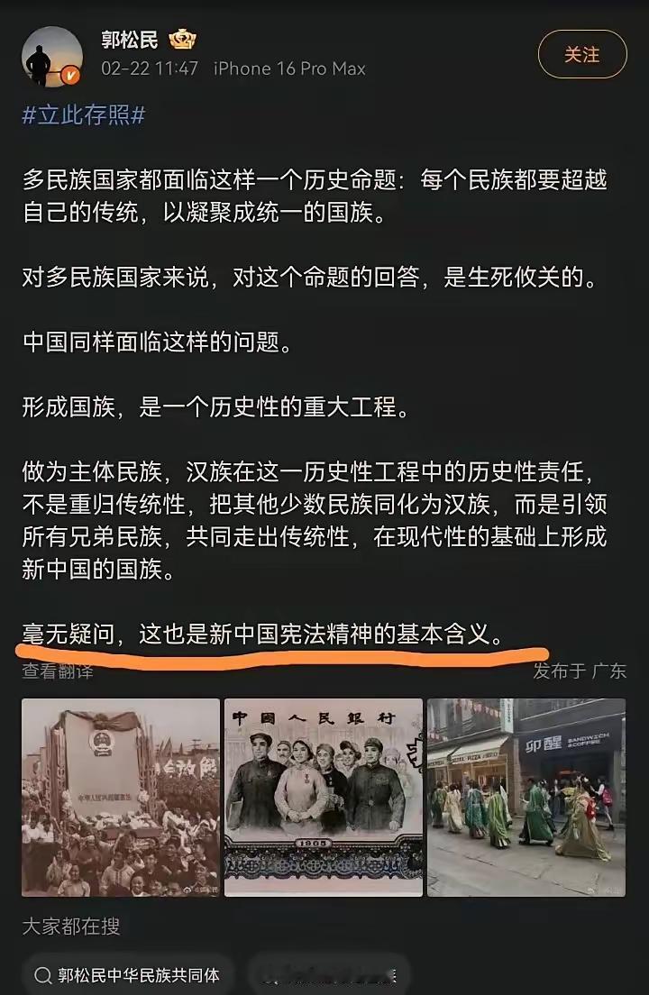 中华民族是56个民族,这是一个大家庭。中华民族就是中华民族,汉族就是汉族,傣族就是傣族。怎么在郭松民的文章里就称为国族,他还说什么每个民族都要超越自己的传统。他说这个话就是西方人说的话。郭松民说中国也要学西方。我就搞不懂了,为什么要学西方啊?你拿西方多少好处啊?让中国人学西方。 他还说。要形成国族 是一个历史性的重大工程。而且他还说作为一个主体民族,汉族在于历史性过程中的历史性责任。把其他少数民族同化为汉族。 而是引领所有的兄弟民族共同走出传统心理。而现代性的基础上,形成新的中国的国族,郭松民。的意思就是。要把汉人的传统也要忘掉。把其他几十个民族的传统也要忘掉。忘掉自己的传统,那就是背叛自己的祖宗。你可以背叛你的祖宗,不能让全中国人背叛祖宗。他竟然还说这是新中国宪法精神的基本含义。简直就是放屁。新中国的宪法哪一条有规定忘记各个民族的传统。 这妥妥的就是汉奸言论。大家怎么看?可以在评论区里了解。 (请同志们点我头像,到我橱窗里面看看呗,有喜欢的用得着的就买两单,谢谢您的支持)