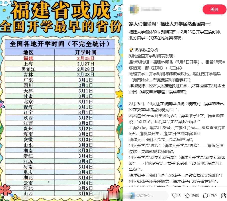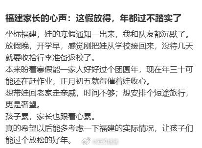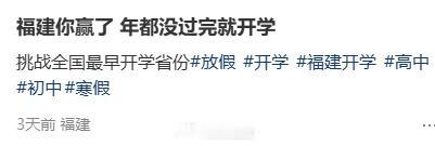 网友称福建今年开学特别早 网友发文称,福建今年初九就报道合理吗?往年都是过了十五才开学吧,今年怎么初九就开学......感觉年都没过完就开学了。(来源网友) via新浪福建 虎纠人讲福州