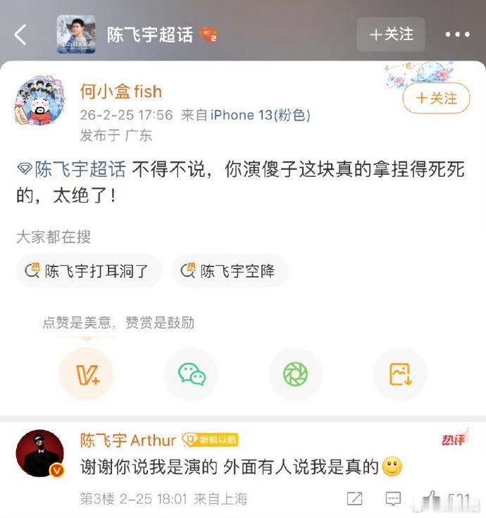 陈飞宇 外面有人说我真傻 陈飞宇因为新剧角色被人说真傻,他回复网友的样子又憨又可爱,高情商直接拉满。