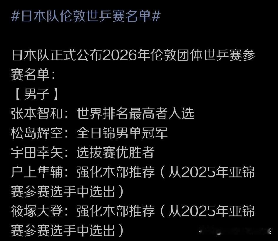 相信很多球迷都已经看了日本乒乓球队提前出炉的世乒赛参赛阵容。透过这份参赛阵容名单,我们会从中发现,日本乒乓球队现在选拔人才参加世乒赛的方式和手段越来越综合全面,而且越来越符合大众预期。 比如他们把世界排名最高目前在世界赛场上竞争力也最足的张本智和,放在了首个被确定参赛的位置。而松岛辉空这位年轻的潜力派小将,近期也确实在各种世界赛场上不断展现个人竞争力,并拿到不俗成绩,甚至世界排名来到前八位,他还有过战胜林诗栋和王楚钦这种国乒顶级高手的经历,而他在全日锦标赛上锁定个人冠军,也让他同样拿到一个世乒赛的参赛名额。 宇田幸矢虽然近期在世界赛场上的成绩稍有起伏,看起来和自己前面的两个队友相比,整体竞争力小有差距。但是他通过日本乒乓球队内的选拔赛,也是获得了优胜,所以这个名额也是靠他自己拼下来的,入围最终世乒赛名单同样没有任何问题。 而另外的两位球员,则是根据他们目前在日本队阵中的整体竞争力,还有在世界赛场上所表现出来的竞技状态,包括在亚锦赛上的发挥,确保他们成为被教练团队推荐参赛的球员,也同样锁定世乒赛的参赛名额。这两个人就是户上隼辅还有篠塚大登。综合来看,日本队其他的男队员还真是在户上还有大登面前没有竞争优势,他们的能力还有稳定性也配得上这样的教练组推荐名额。 那么大家对于日本男乒的这种阵容选拔方式,还有所产生出来的这5位参赛球员,有何观点、看法?又对国乒整个团队最后5个参赛球员到底会是谁有何期待?也希望朋友们给出自己心中的答案,大家共同交流探讨。同时让我们一起期待着国乒团队在世乒赛的比赛场上能给球迷们持续贡献精彩,也让我们看看国乒团队和日本男乒的球员们,在世乒赛这种顶级的乒乓舞台上会贡献怎样的发挥。