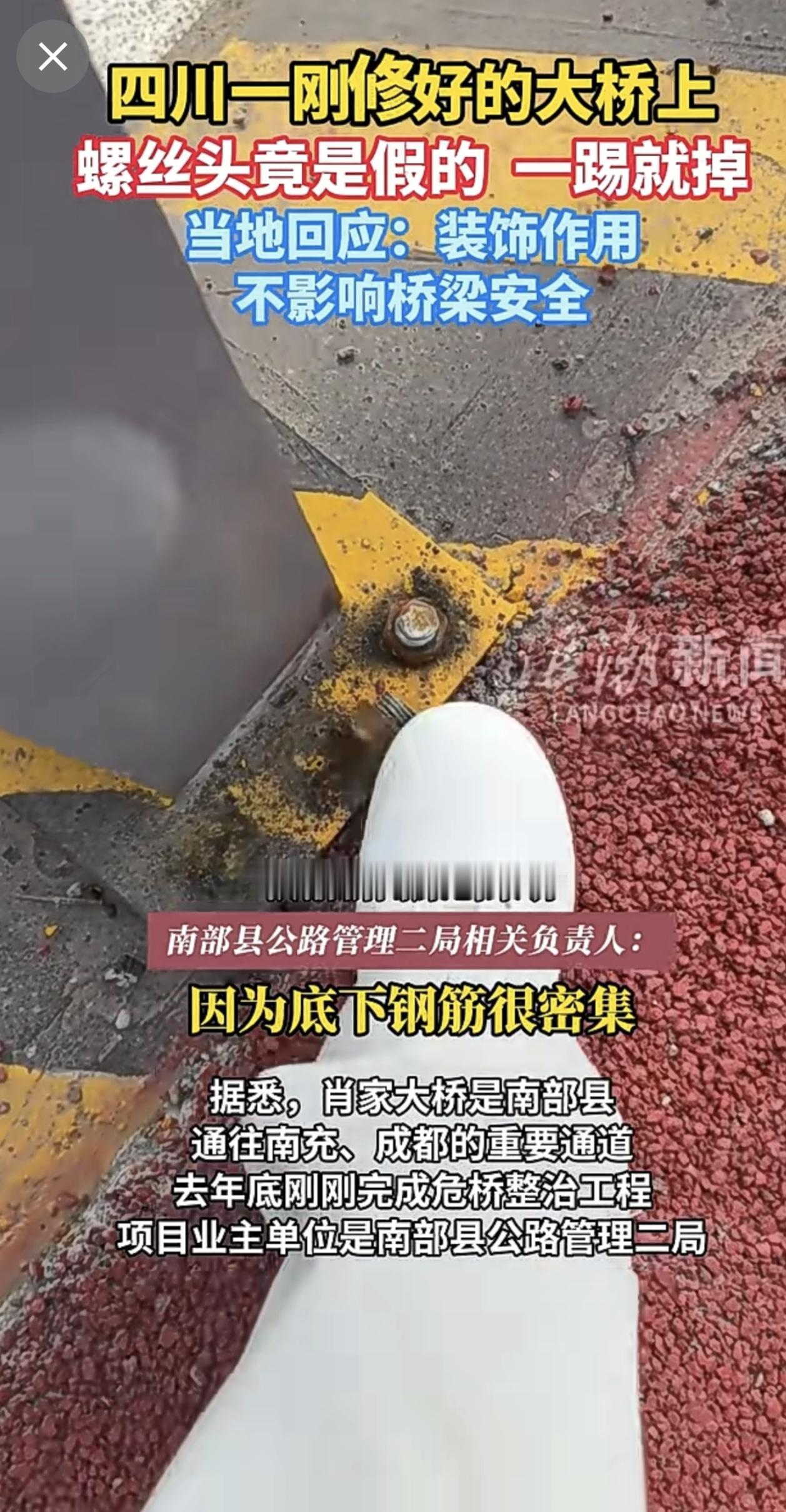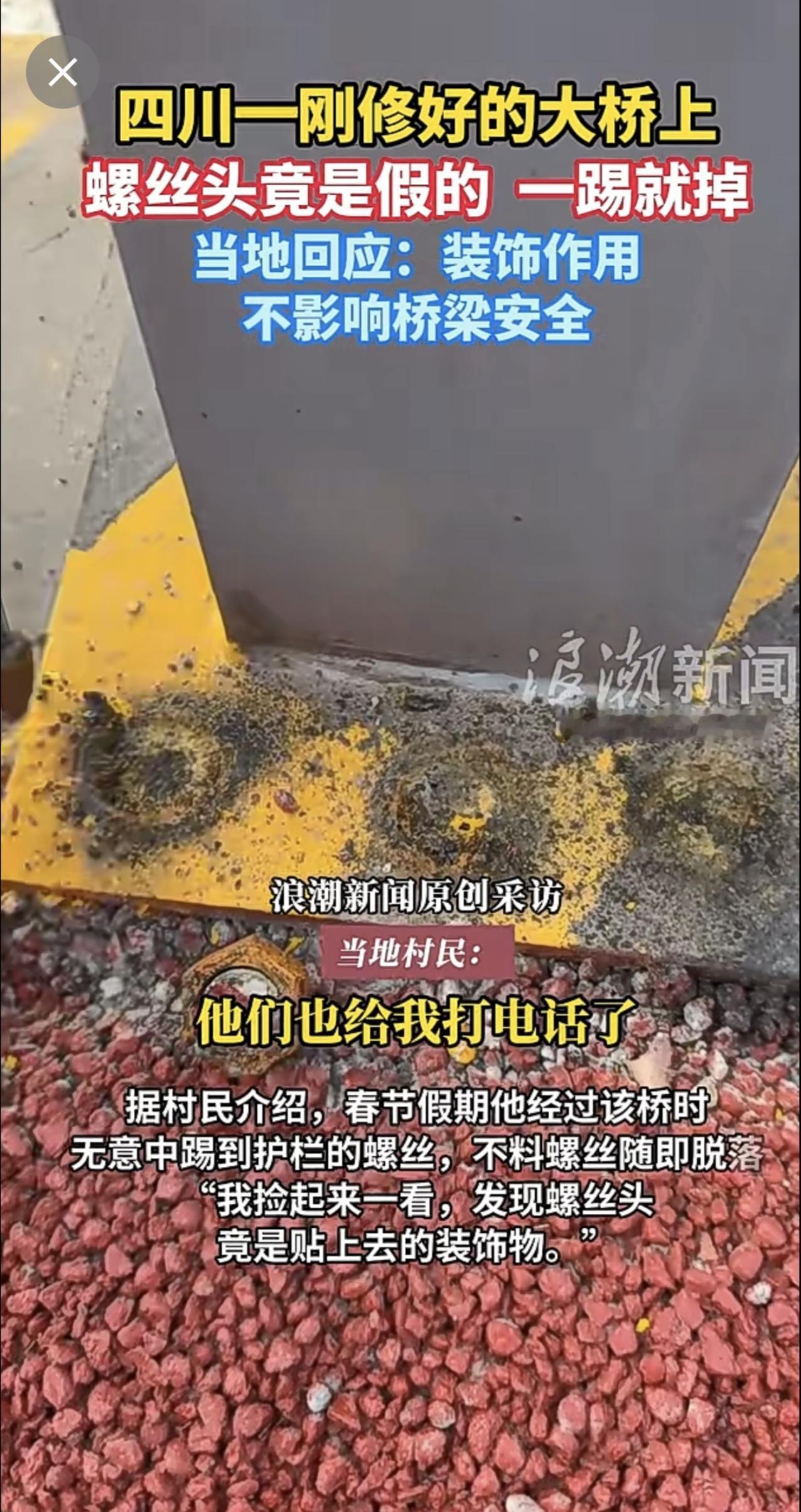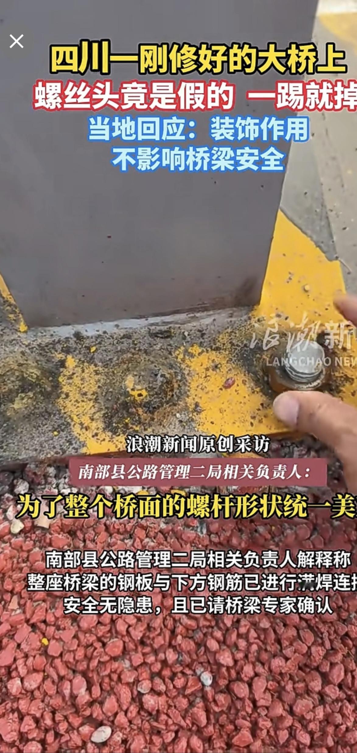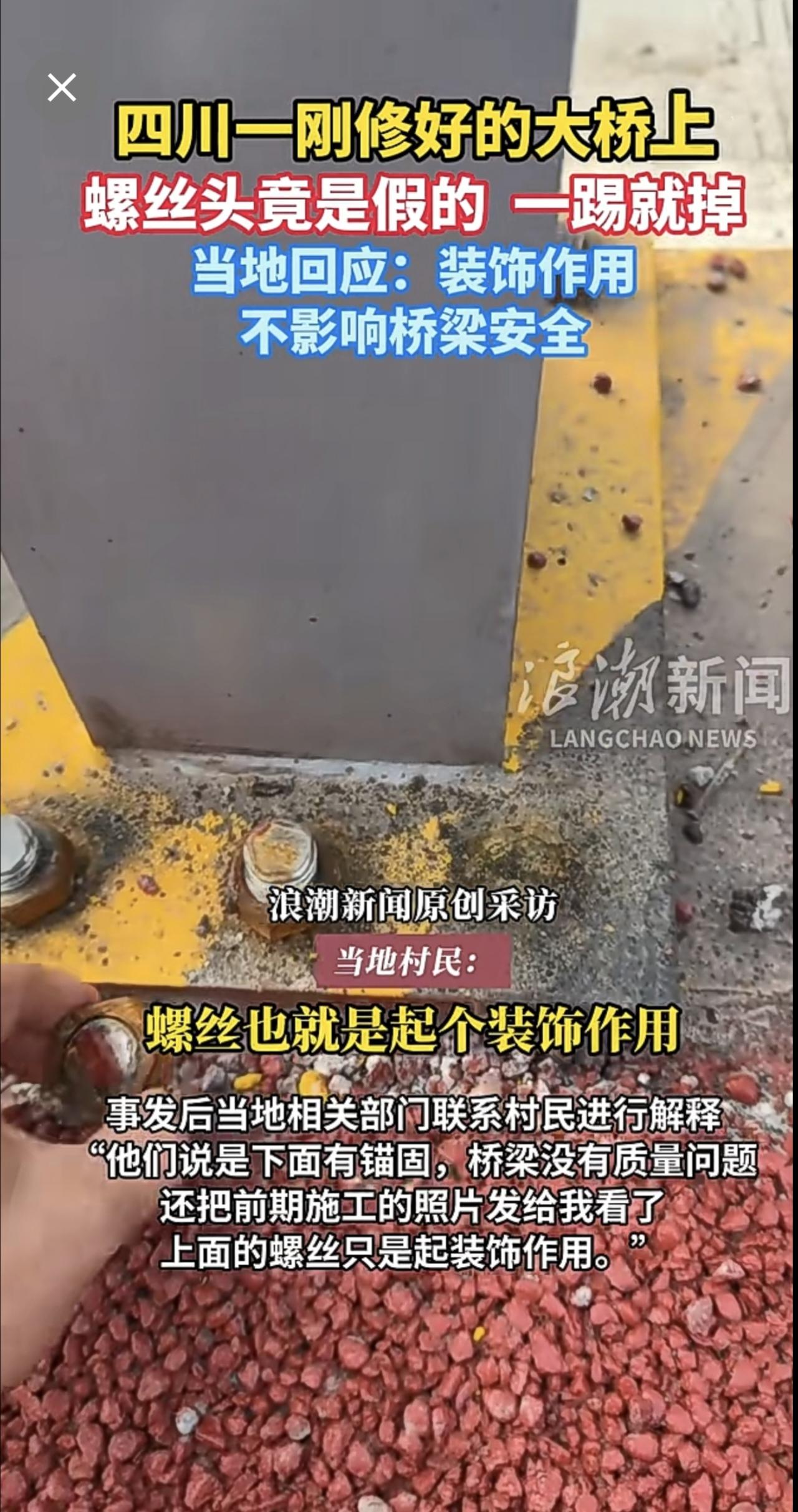 四川一刚修好的大桥上 螺丝头竟是假的,一踢就掉 当地回应:装饰作用,不影响桥梁安全。