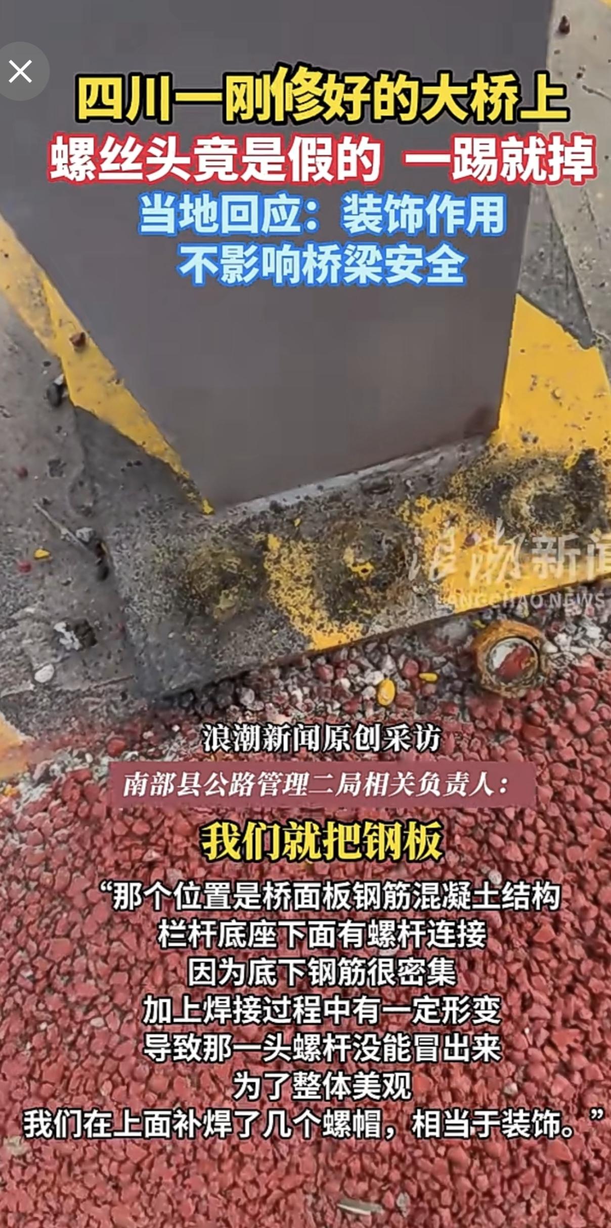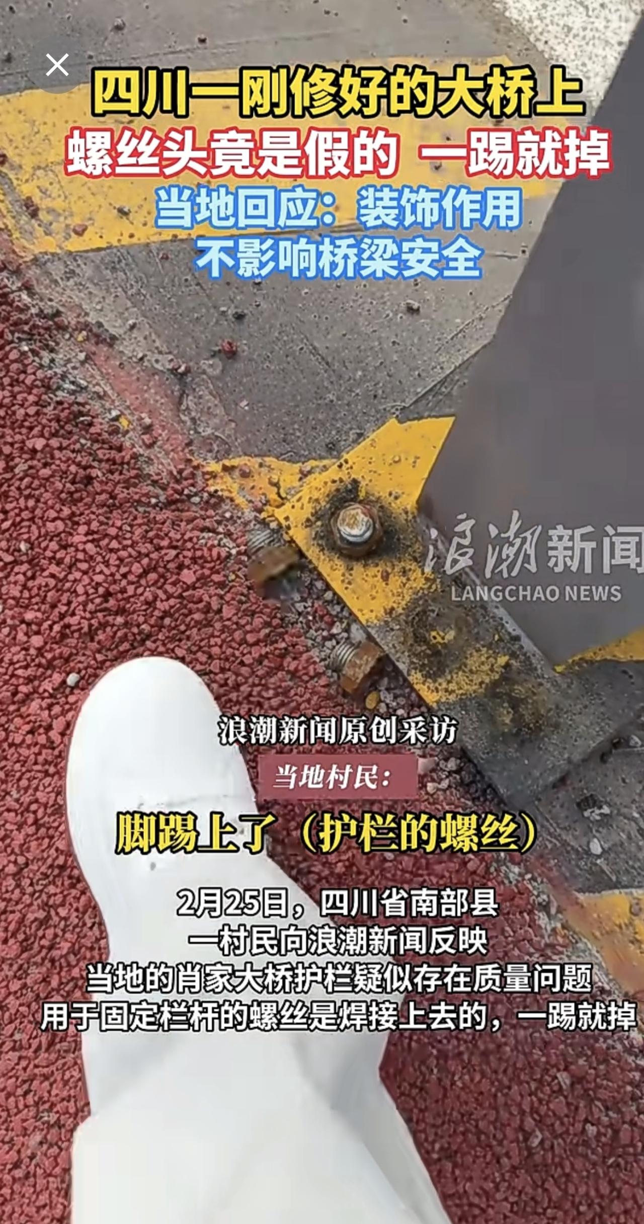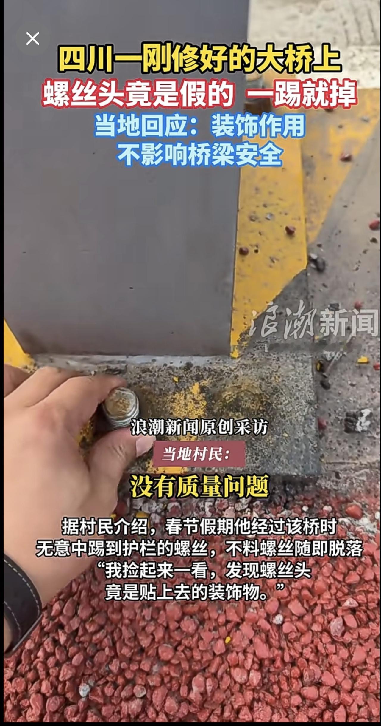 四川一刚修好的大桥上 螺丝头竟是假的,一踢就掉 当地回应:装饰作用,不影响桥梁安全。