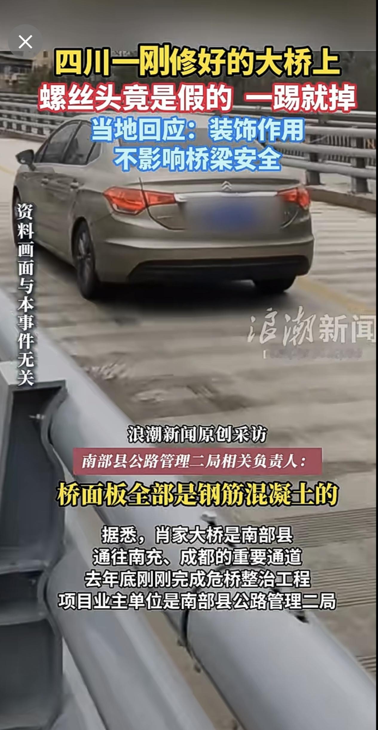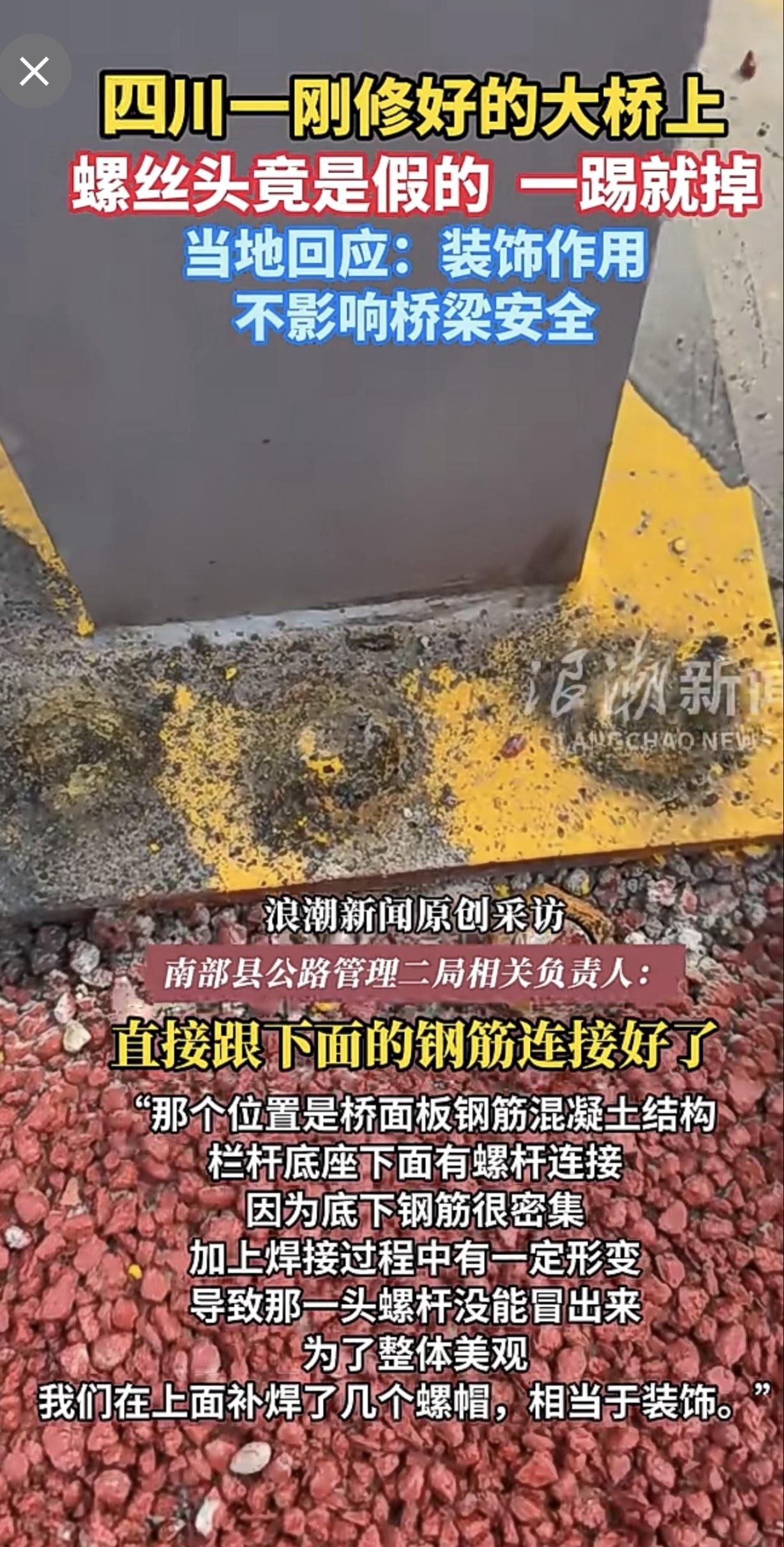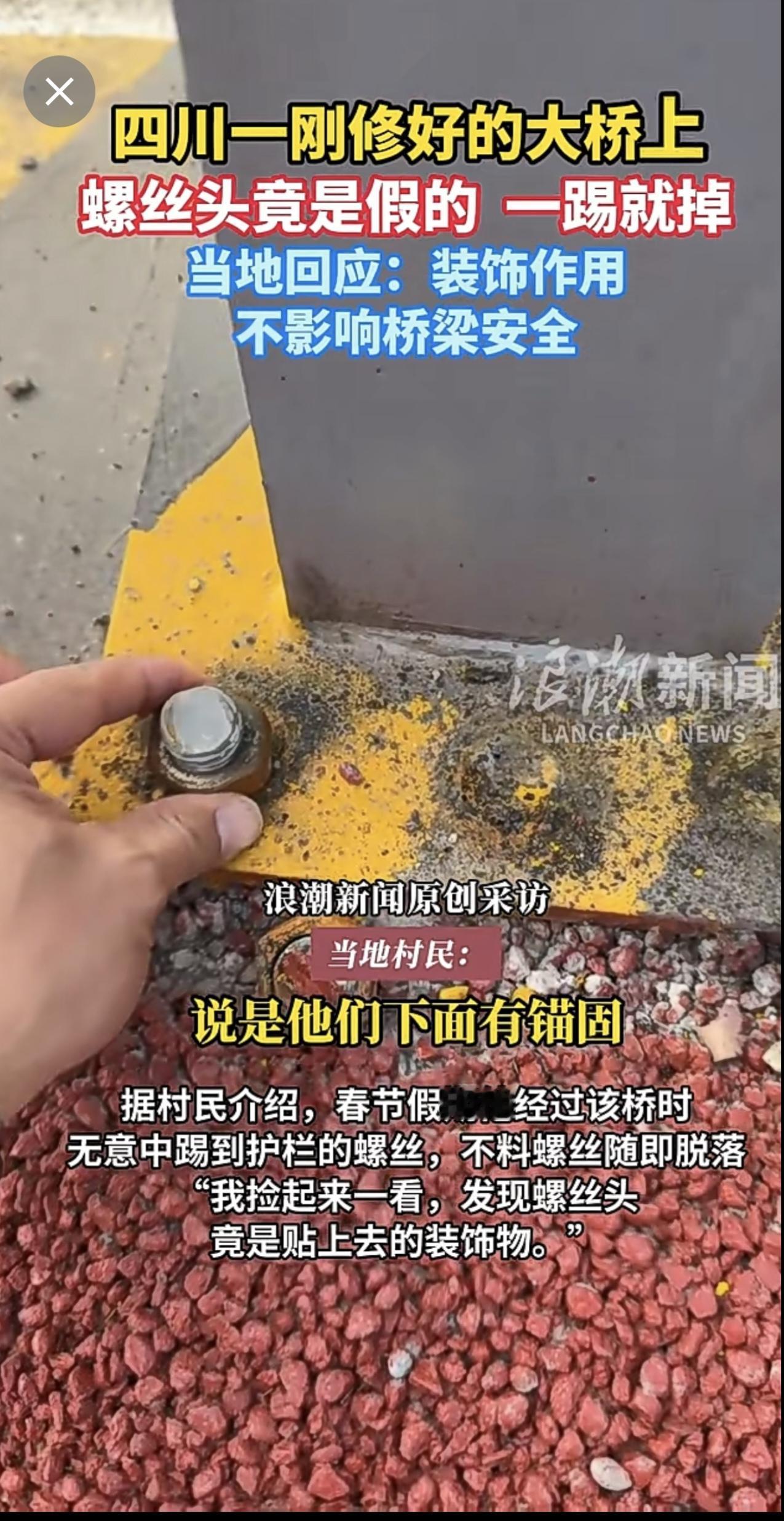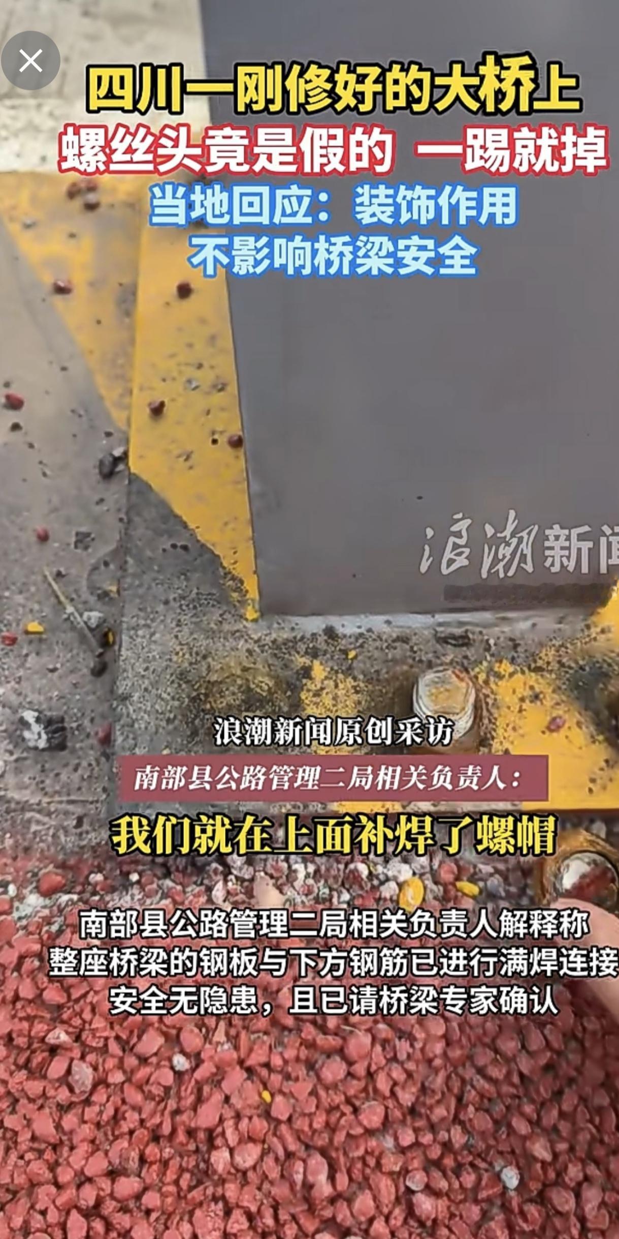 四川一刚修好的大桥上 螺丝头竟是假的,一踢就掉 当地回应:装饰作用,不影响桥梁安全。