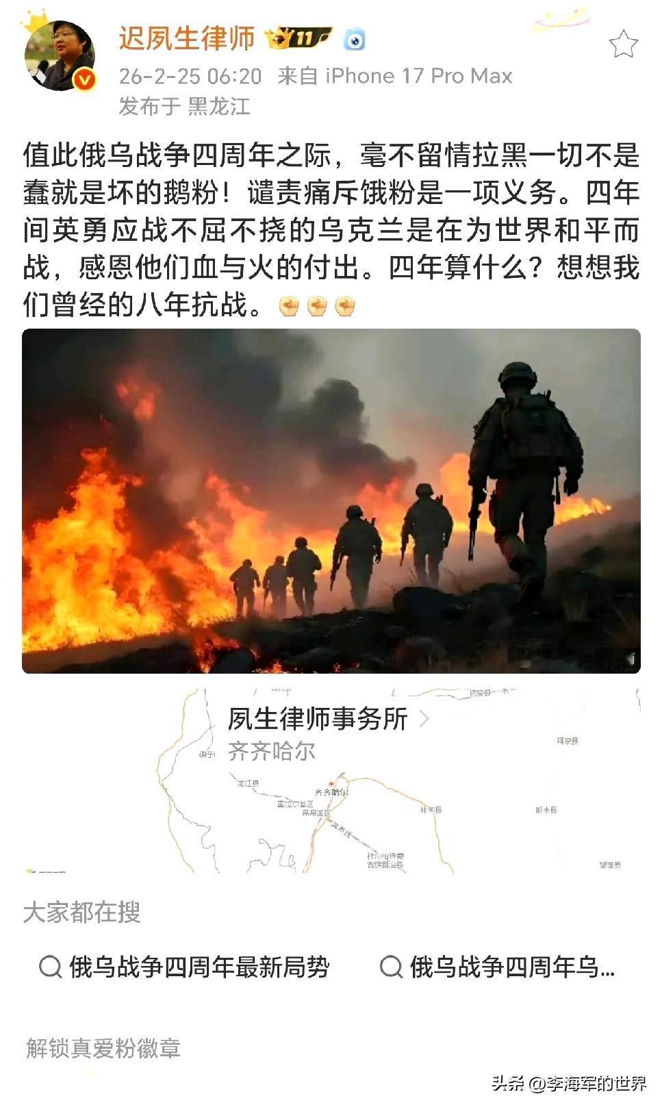 又是律师!竟拿俄乌冲突类比八年抗战,还感恩乌克兰为世界和平而战,感恩他们血与火的付出。 你喜欢、崇拜乌克兰,本也无可厚非。但说乌克兰是为世界和平而战,感恩他们血与火的付出,这纯属无稽之谈。 这场冲突中,乌克兰是在为美西方利益而战,并非为了自身,更谈不上为世界和平而战。 将乌克兰战争与我国抗战相提并论,这是对为中华独立献出生命的英烈的侮辱。 我们经历了14年抗战,作为律师,他不可能不知,却故意提及八年抗战。 仅这一点,就足以看出这个律师立场严重偏差,他心向西方,而非中国。 乌驻日大使曾在去年抗战胜利日参拜靖国神社,还宣称制造南京大屠杀的战犯为“烈士”。 乌克兰最高拉达议员贡恰连科更是公开表示,乌克兰人愿意为美国而与东方战斗。 网友称其为无知蠢货。 他并非愚蠢、无知,而是纯粹的坏。 他所谓的“爱乌”,不过是个口号,是他利用的棋子,其真正目的是恨国。 客观来讲,俄乌之战是一块试金石,能检验出一个人是否具备最起码的人性! 俄乌冲突