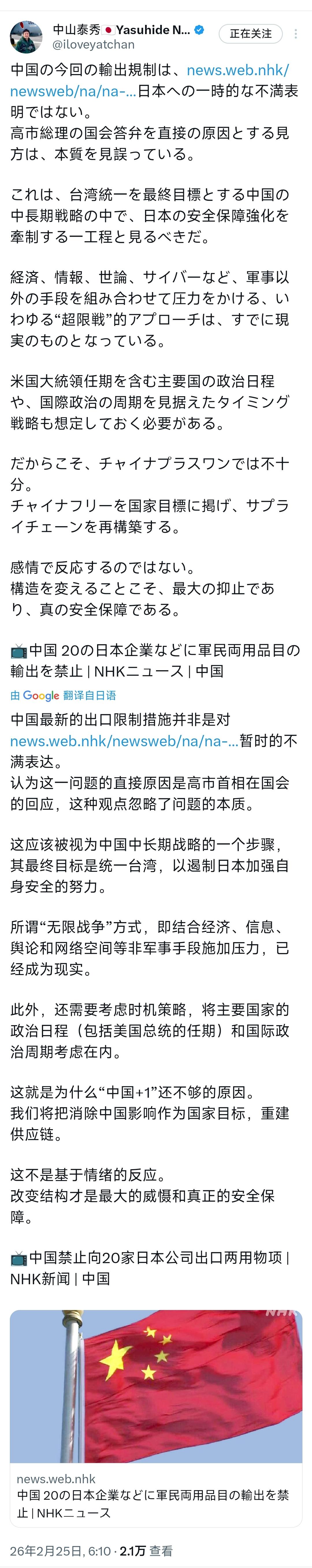 2 月 25 日,日本政坛里专门管外交事务的核心人物 —— 众议院外务委员长、前外务副大臣中山泰秀,公开发表了一段针对中国出口管制的言论。 这位可不是普通的日本议员,他既在国会主导外务事务,还当过日本外务副大臣,在日本外交和安保决策圈里,是能说上话、有实际影响力的人物,他的这番话,也直接把日本部分政坛势力的真实想法摆到了台面上。 中山泰秀一开口,就先推翻了外界对中国出口管制的普遍看法。 他直言,中国这次出台的出口管制措施,根本不是对日本一时的情绪发泄,也不是简单的不满表达。 很多人觉得,中国是因为日本高市首相在国会的答辩内容,才针对性出台管制措施,在中山泰秀眼里,这种看法完全没摸到本质,属于典型的误判。 在他的解读里,中国的出口管制要放在更大的战略框架里看。 他认为这是中国以实现台湾统一为最终目标的中长期战略中,专门用来牵制日本强化安保政策的关键一步。 简单来说,他不把这当成普通的经贸摩擦,而是直接和台湾问题、日本的安保政策调整绑在了一起。 不光如此,中山泰秀还给出了更具体的解读,他声称中国已经把经济、信息、舆论、网络这些非军事手段组合起来,用这种他口中的 “超限战” 方式施压,而且在他看来,这种做法已经成为现实。 他还特意提醒日本方面,要提前做好预判,认为中国会盯着美国大选任期、其他主要国家的政治日程,以及国际政治的周期来选择行动时机,这都是日本需要重点提防的点。 基于这些自己的判断,中山泰秀直接给日本指了一条他认为 “最稳妥” 的路。 他明确表示,日本现在只搞 “中国 + 1” 的供应链策略,根本远远不够。 可能很多中老年朋友不清楚 “中国 + 1” 是啥,其实就是日本企业为了分散风险,供应链不只依赖中国,再额外找一个国家做备用。 但中山泰秀觉得这种做法太温和、太保守,他直接提议,日本应该把 “去中国化” 正式列为国家层面的核心目标,彻底推倒重来,重新构建整个供应链体系。 他还特意强调,日本别被一时的情绪带着走,不要做一些临时的应急反应,真正能解决问题的办法,是从根本上改变供应链的结构。 在他的认知里,这种彻头彻尾的结构性改变,才是对中国最大的威慑,也是日本能获得真正安全保障的核心办法。 咱们掰开揉碎了用大白话讲,中山泰秀的核心逻辑就是:把单纯的经贸问题,彻底往地缘政治、国家安全上靠。 他不愿意把中国的出口管制看成正常的贸易反制,反而硬要和台湾统一、日本安保绑定,刻意放大所谓的 “战略威胁”。 作为日本众议院外务委员长,他的这番表态,也不是个人随口吐槽,而是代表了日本政坛保守势力的主流想法 —— 不再满足于小范围的供应链分散,而是想推动国家层面的 “脱钩断链”,从根源上降低日本对中国的经济依赖。 他把出口管制和台湾问题挂钩,也是日本部分政客一贯的操作,总喜欢把中国的内部事务和中日经贸、外交问题捆绑,以此为借口推动日本自身的安保政策调整。 而他对 “中国 + 1” 的否定,也能看出日本国内 “对华强硬” 的声音越来越高,不再想着互利共赢,反而一门心思要搞 “去中国化”,用供应链重构来应对所谓的 “战略压力”。 中山泰秀的这番发言,没有激烈的情绪化指责,反而用看似理性的分析,把对华强硬、推动 “去中国化” 的主张包装得头头是道。 从他的身份和发言内容就能看出来,当前日本政坛对华的战略认知,已经朝着更强硬、更戒备的方向发展,而他的这番话,也让外界更清晰地看到了日本外交圈层的真实心态。