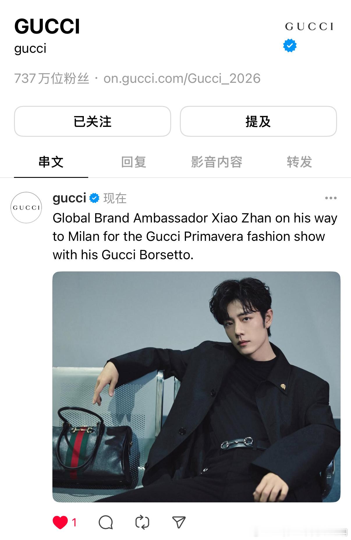 肖战切错号了所以Gucci账号在代言人手上吗?太爱了吧明天见哇!