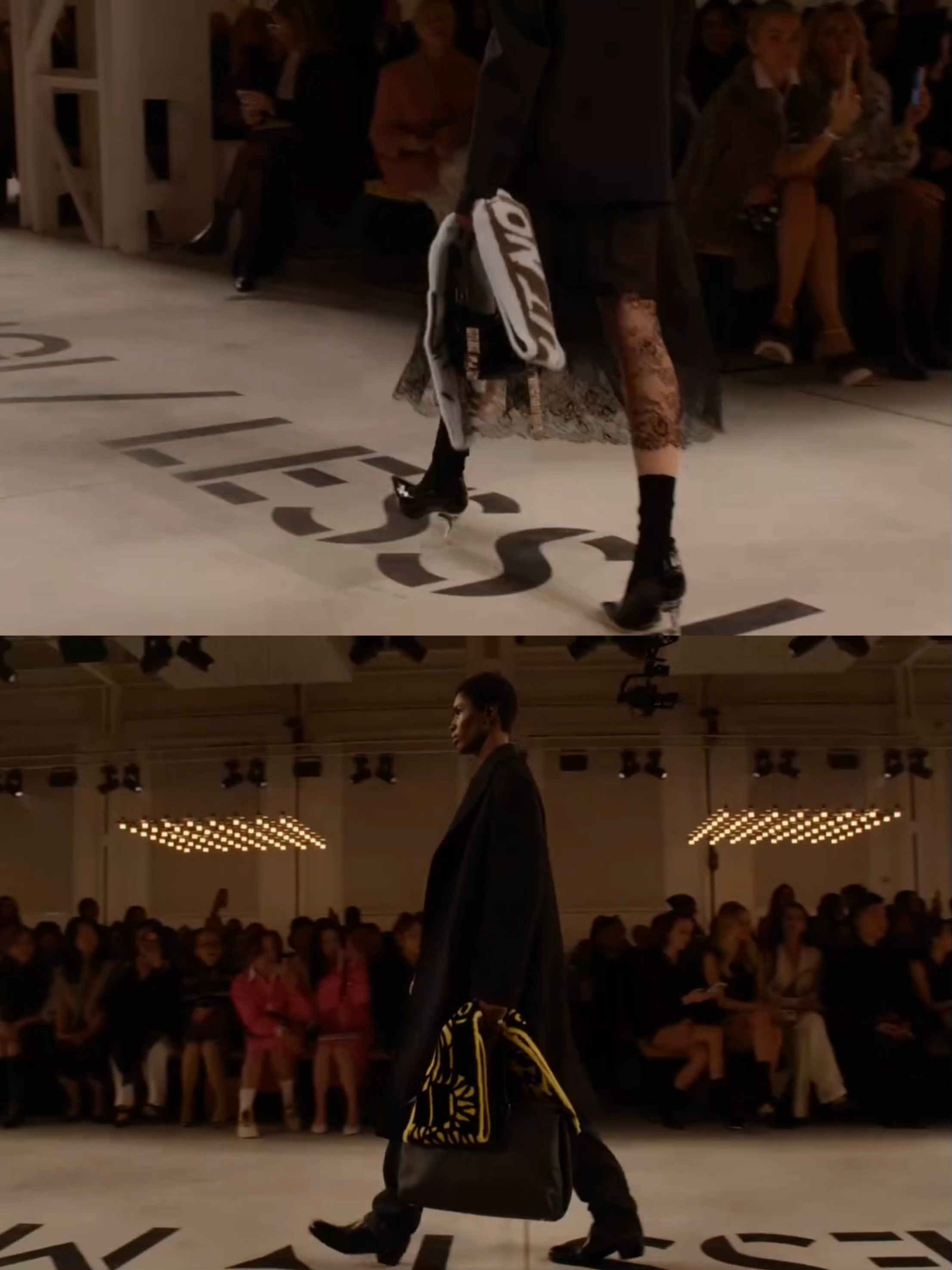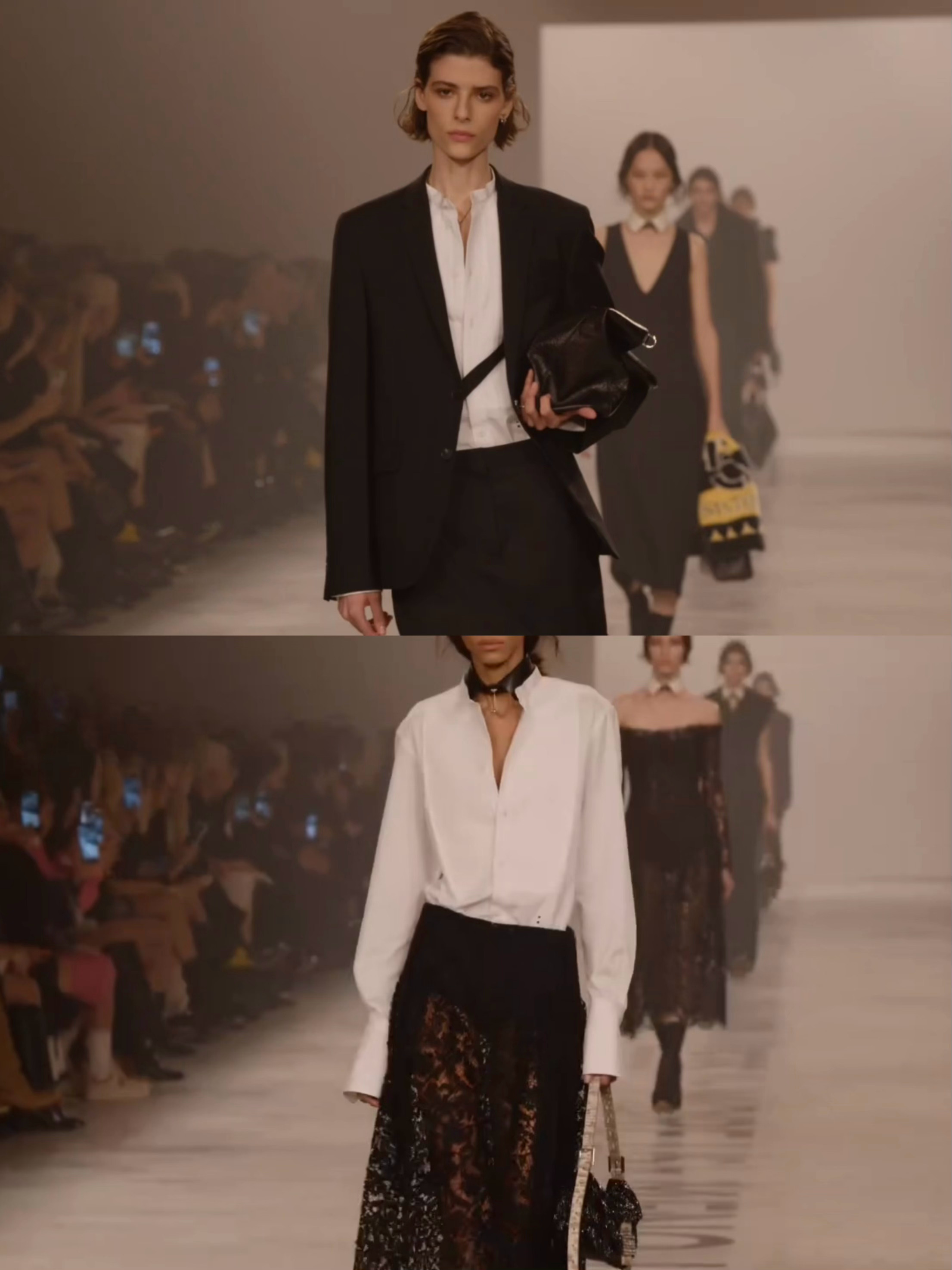 光影交错的氛围间男女模特并肩而行 ,模糊衣橱的性别界限 ,回归以服装作为日常存在之物的思考。这便是本季的另一大核心命题创作 —— 回归欲望 ,回归身体本身。衣裙旨在陪伴我们的生活 、我们的情感 、我们的渴望。 这一切 ,皆融于个人对于时装与自我的独到见解之中。