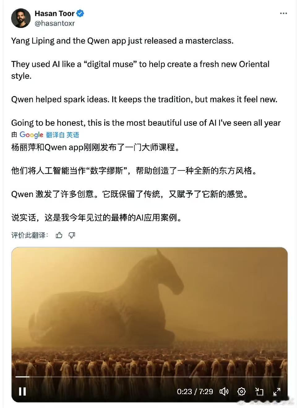 美国AI大牛盛赞杨丽萍千问节目 堪称科技与国风的巅峰碰撞!千问AI深度解析中式奔马神韵,杨丽萍以极致舞蹈演绎万马奔腾,用东方美学震撼世界,这是中国AI与传统艺术双向奔赴的最好证明。