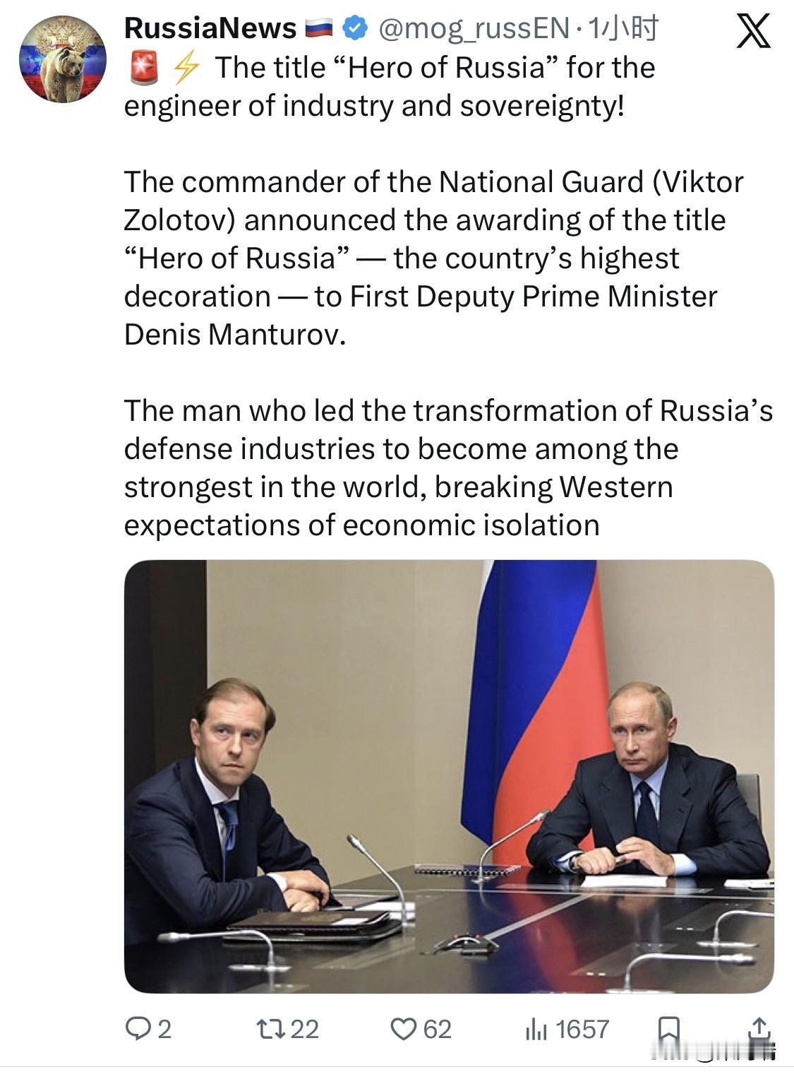 俄罗斯总统普京已正式签署命令,授予俄罗斯第一副总理丹尼斯·曼图罗夫(Denis Manturov)“俄罗斯联邦英雄”称号。 最高荣誉:“俄罗斯英雄”是俄罗斯国家的最高级别荣誉,获得者将被授予“金星奖章”。 引荐人:俄罗斯国民近卫军(Rosgvardia)总司令维克托·佐洛托夫(Viktor Zolotov)公开宣布了这一消息,并在活动中将曼图罗夫介绍为“俄罗斯英雄”。 获奖人背景:曼图罗夫曾长期担任工业和贸易部长,并于 2024 年 5 月晋升为第一副总理,负责统筹俄罗斯的工业和国防生产。 授勋原因与工业转型 根据相关报道和佐洛托夫的表态,曼图罗夫获得此项殊荣主要基于以下功绩: 国防工业转型:他领导了俄罗斯国防工业体系的全面动员和转型,使军工生产能力大幅提升,满足了前线对先进武器装备的需求。 打破经济孤立:在面对西方国家前所未有的严厉制裁下,他成功推动了俄罗斯的“技术主权”战略和进口替代进程,确保了国民经济和国防工业的稳定运行。 关键装备产出:在他的领导下,俄罗斯预计在 2025 年有超过千种新型军事装备投入前线测试,其工业动员能力超出了许多西方分析人士的预期。 佐洛托夫的角色 作为普京的长期盟友,佐洛托夫领导的国民近卫军直接隶属于总统。他在正式场合宣布这一授勋,体现了克里姆林宫对“工业战线”功臣的高度认可。此前,佐洛托夫也曾代表总统向参与特别军事行动的其他高级军官颁发过金星奖章。