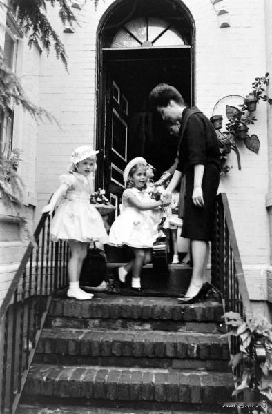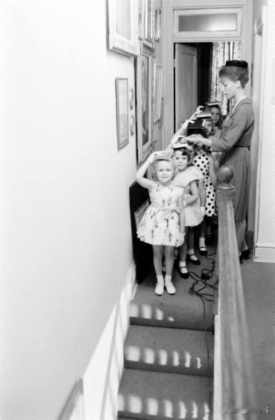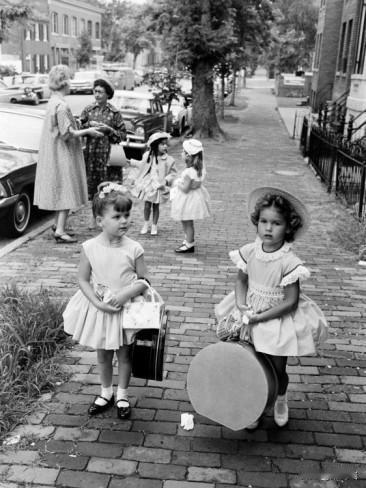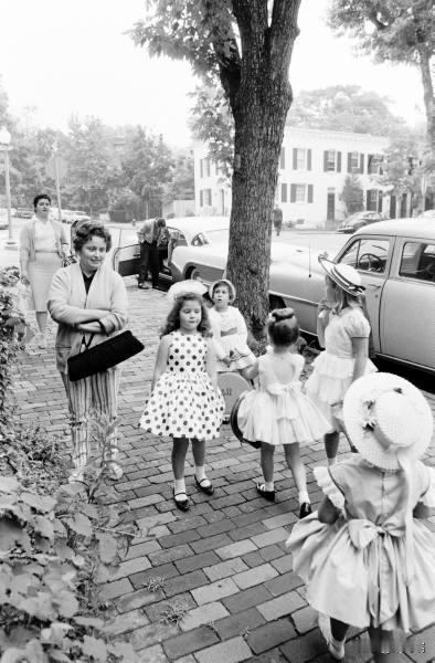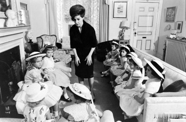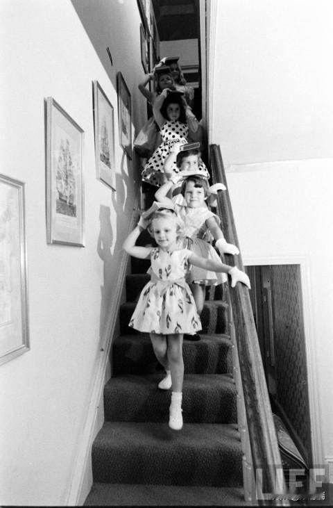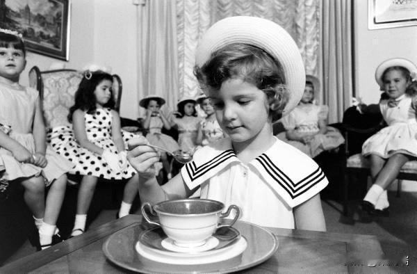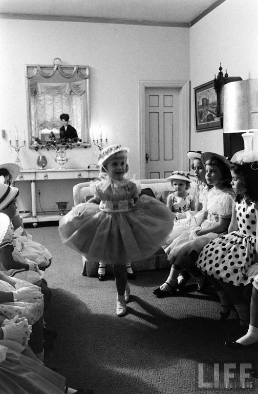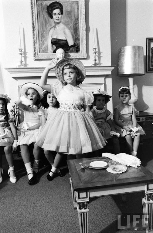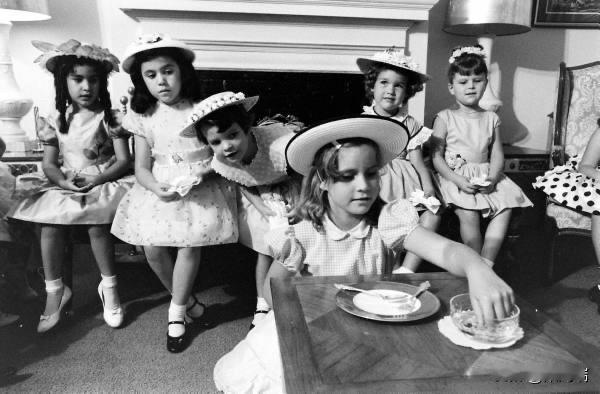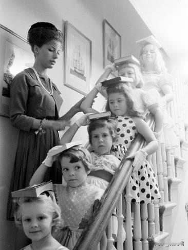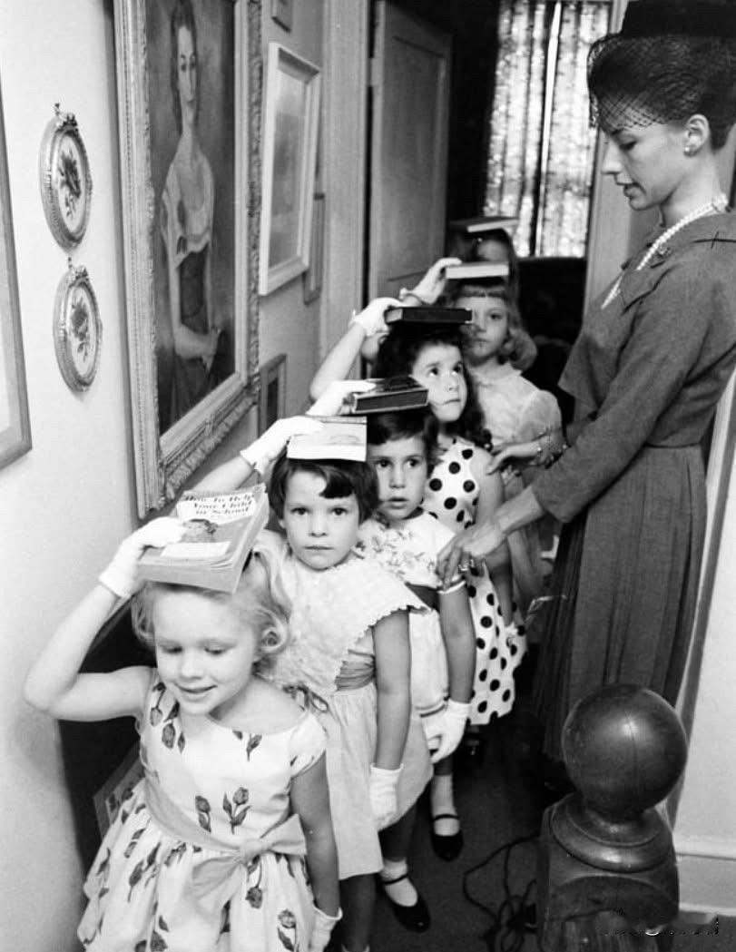 这张照片展示了 1962年 华盛顿特区 莫佩特礼仪学校(Moppets Charm School)的学生们正在练习姿态的场景。 一群穿着连衣裙的小女孩正在杨夫人的课上练习将书顶在头上行走,以此来改善她们的体态并培养端庄的举止。 这组经典照片由摄影师 亚瑟·里克比(Arthur Rickerby)为《生活》(LIFE)杂志拍摄。 在 20 世纪中期,这类姿态训练是年轻女性教育的常见组成部分,反映了当时社会对女性礼仪和文化素养的期望。