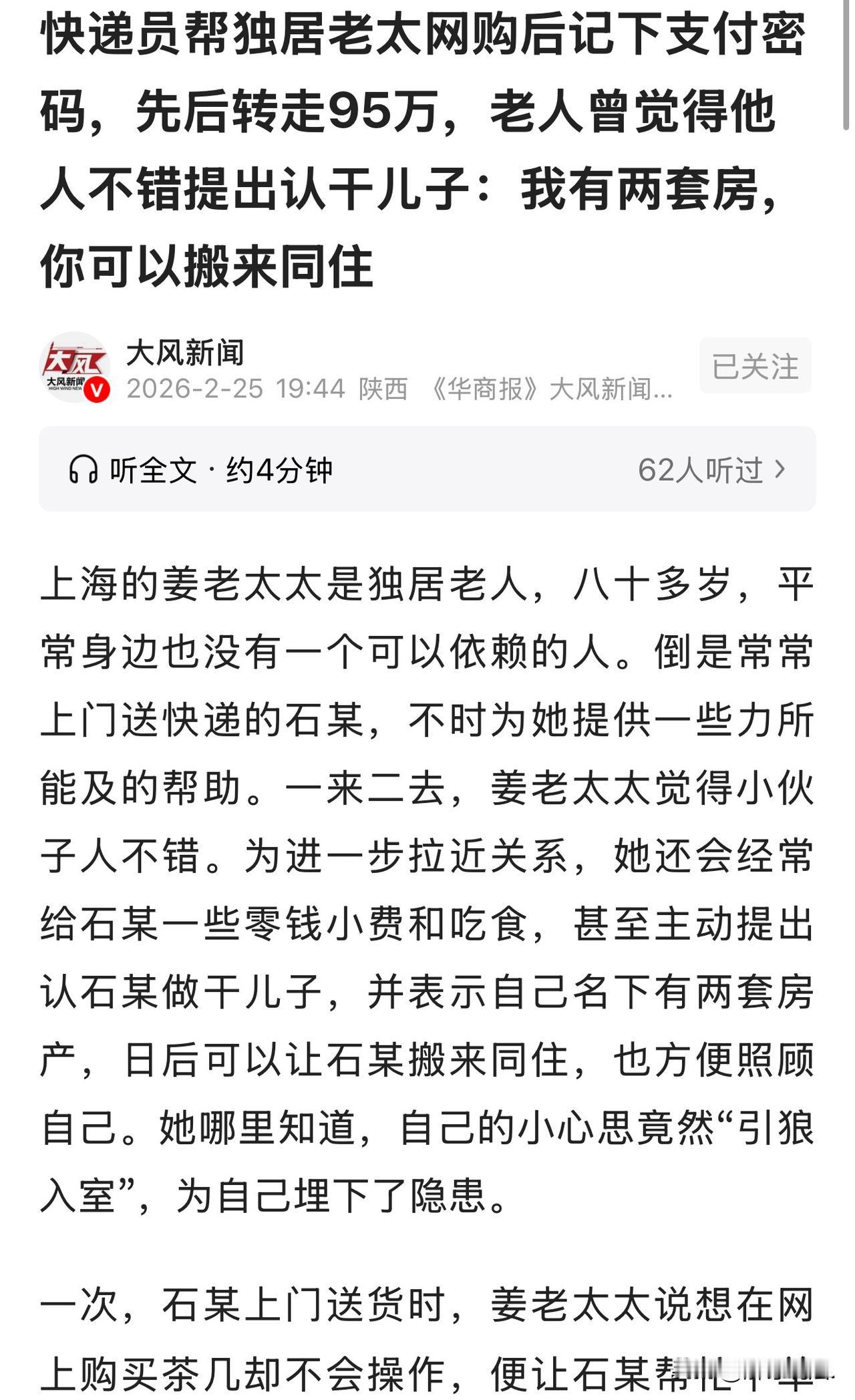 “引狼入室!”上海,80岁老太老伴早年去世,儿女不在身边,独自生活,倍感孤独。与快递员小伙子接触中,对方主动帮她扔垃圾、搬东西,对她嘘寒问暖,老太感动不已,想认对方当干儿子。还告诉对方自己有两套房子,希望他搬来陪自己住。一次,因不会在网上买茶几,求小伙子帮她买,向对方泄露了支付密码。谁知,其别有用心,竟偷偷记住密码。因其背负高利贷,正愁没钱还,于是,借帮老太购物的机会,先后转走老太95万元。天网恢恢疏而不漏,最终,被老太发现了,并报了警,小伙子悲剧了。 都说“优秀的孩子都是上交给国家的,只有普通的孩子才能承欢膝下”,这句话,80多岁的姜老太体会得最为深刻。 姜老太的儿女个个出类拔萃,在各自的事业领域里闪闪发光,却唯独没有时间陪伴年迈的母亲。 他们只能用金钱表达孝心,可姜老太最需要的从不是钱财,而是有人能陪她说说话、解解闷。 老伴早逝,子女远在他乡各自忙碌,偌大的房子里只剩姜老太孤身一人,冷清得能听见空气流动的声音,晚年的孤独将她紧紧包裹。 长久的独居生活里,频繁上门送快递的快递员石某,成了她唯一的外界往来。 石某上门送件时,总会和老人唠几句家常,顺手帮忙搬重物、扔垃圾,这些微不足道的善意,在孤寂的姜老太眼中,成了难得的温暖。 一来二去,老人打心底里觉得石某踏实可靠,将他视作晚年的依靠。 为了留住这份温暖,姜老太对石某愈发亲近,时常给他零钱和零食,感情渐深后,更是主动提出认石某做干儿子,还坦言自己名下有两套房产,邀请他搬来同住,互相照应。 彼时的姜老太满心憧憬着这份突如其来的“母子情”,却不知自己早已引狼入室。 此时的石某正深陷高利贷泥潭,被催债逼得不敢回家,经济压力和内心的贪婪,让他把老人的善意当成了敛财的机会。 一次上门送件时,姜老太因不会网购茶几,请求石某帮忙操作,还毫无防备地告知了微信支付密码。石某表面耐心帮忙,暗地里却悄悄记下了密码,罪恶的念头就此滋生。 几天后,石某试探着用老人手机给自己转了0.1元,成功后便大胆转走1500元。起初他还提心吊胆,可多次上门后,姜老太毫无察觉,依旧对他热情信任,这让石某的胆子越来越大。 他借着帮老人操作手机的机会,一次次偷偷转账,金额从几千元涨到上万元,愈发肆无忌惮。 得知姜老太有炒股资金和老伴留下的遗产后,石某更是认定老人“不差钱”,盗窃行为变本加厉。 他将偷来的钱全部用于偿还高利贷、个人挥霍,还大手笔给网络主播打赏,在纸醉金迷中挥霍着老人的毕生积蓄,这场隐秘的盗窃,持续了整整一年多。 2025年9月,姜老太发现工资卡钱款变少,以为遭遇诈骗便报了警,还第一时间联系了石某。 做贼心虚的石某匆忙赶到,将仅有的6000元转给老人,谎称钱款已找回,单纯的姜老太信以为真,并未深究。 可贪婪的欲望从未停止,没过多久,姜老太再次请石某上门帮忙买菜,石某看到老人账户还有二三十万,再次伸出黑手。 2025年11月,被债务逼急的石某,甚至主动以调整网速为由上门,短短两天就疯狂转走9万余元。 法网恢恢,疏而不漏。案发后经核查,石某累计窃取姜老太95万余元,所有钱款均被挥霍一空。 《刑法》第264条:盗窃公私财物,数额较大的,或者多次盗窃、入户盗窃、携带凶器盗窃、扒窃的,处三年以下有期徒刑、拘役或者管制,并处或者单处罚金;数额巨大或者有其他严重情节的,处三年以上十年以下有期徒刑,并处罚金;数额特别巨大或者有其他特别严重情节的,处十年以上有期徒刑或者无期徒刑,并处罚金或者没收财产。 石某利用姜老老太的信任,先后窃取95万元,构成盗窃罪,其数额巨大,等待他的是10年以上的刑事处罚。 此事曝光后,网友炸锅了: 这沙雕天胡牌打成天崩,老太太提出来了还不火速认个干妈,平时嘴甜点身体勤快点,帮老太太料理些日常,过了一年半载感情深厚了,日常哭诉一下年轻人压力大不容易,不信老太太无动于衷,不比这种方式强。 这个就是一个混子,又网赌,又借高利贷,还给主播打赏。吃喝嫖赌样样精。要是聪明人。真认老太太当干娘。这钱还是自己的呀。 个人认为:这件事不仅戳破了人性深处的贪婪与冷漠,更道尽了独居老男人的心酸。 优秀的子女远走高飞,为生活与理想奔波,却让老人在空荡的房子里守着孤独。正是这份无处安放的孤单,才让别有用心之人有了可乘之机。 这不仅是一个家庭的伤痛,更提醒着所有人:关爱老人,不止于金钱赡养,在于一句问候、一次陪伴、一份看得见的安心。