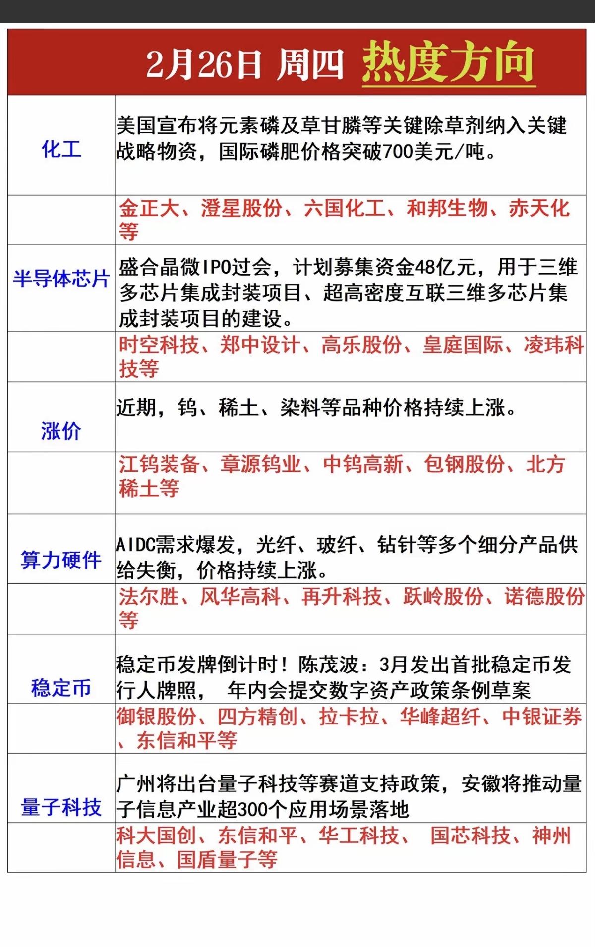 2.26周四 市场热点+投资方向! 1.磷化工、草甘膦 2.半导体芯片 3.涨价概念:稀土、染料、小金属 4.算力硬件 5.稳定币 6.量子科技