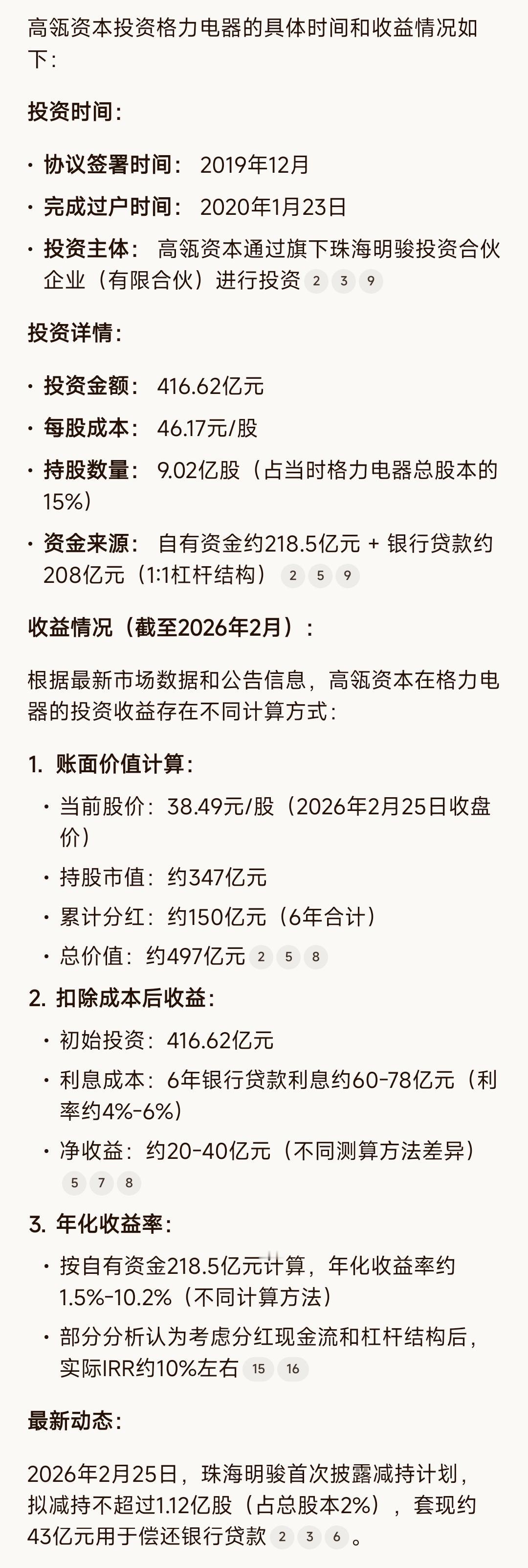 格力的大股东高瓴资本也坚持不住了,开始减持了,当初高瓴资本400多亿投资格力,到今天是赚是赔呢? 肯定赔的,这400亿要是当初投黄金,投AI早就变成1000亿了,放在格力里面吃利息简直是亏大了,老话说得好——我在茅台里躲牛市,高瓴资本可不就是这样!