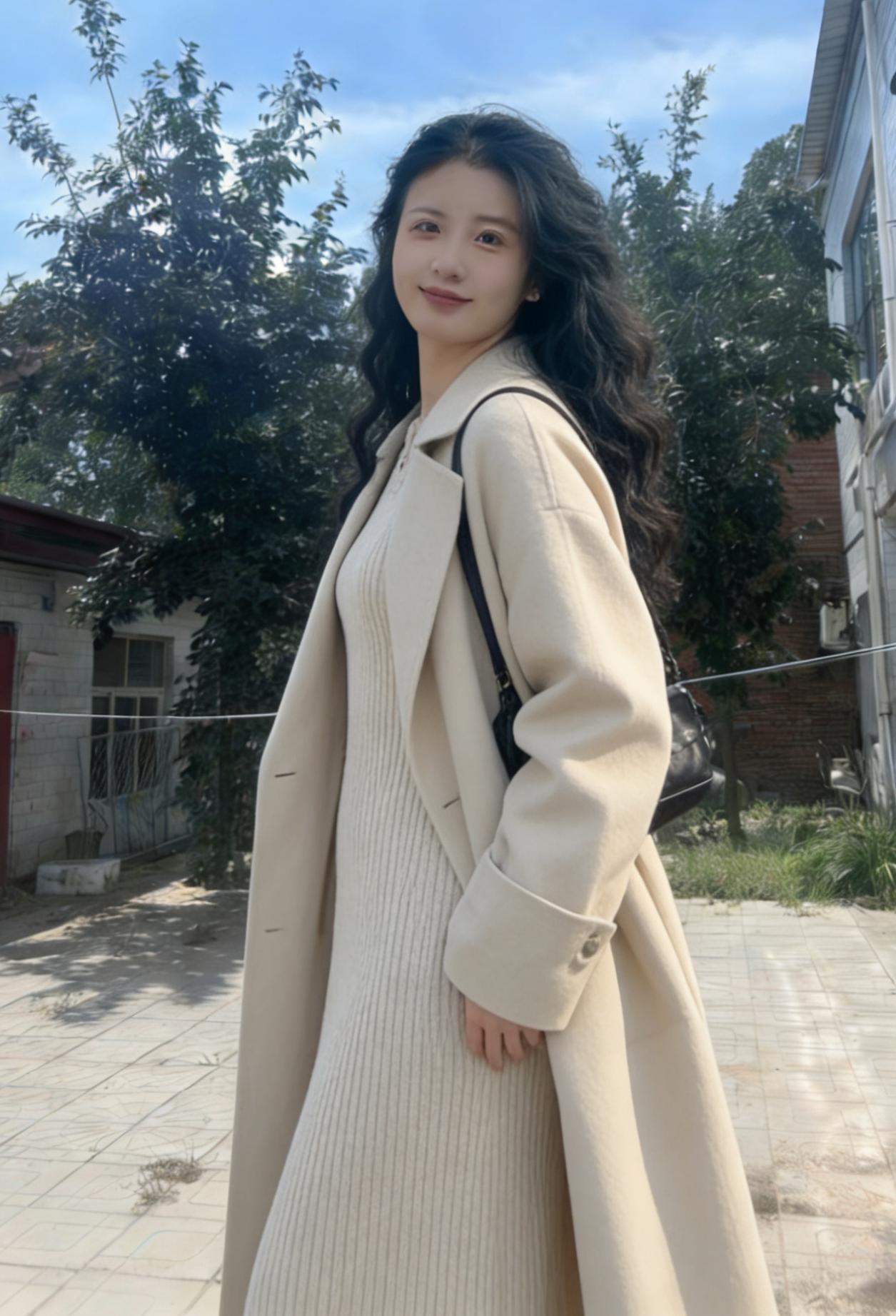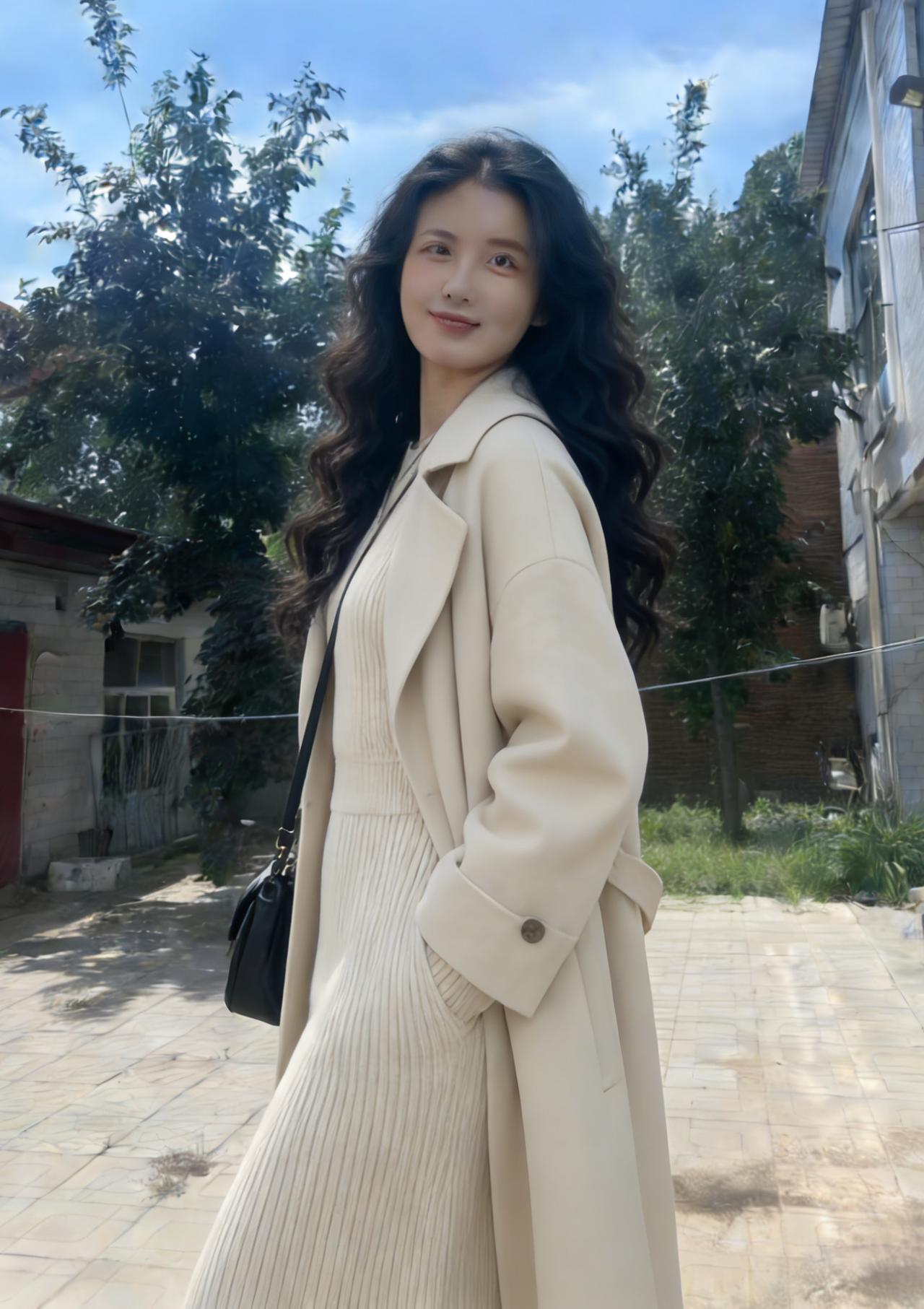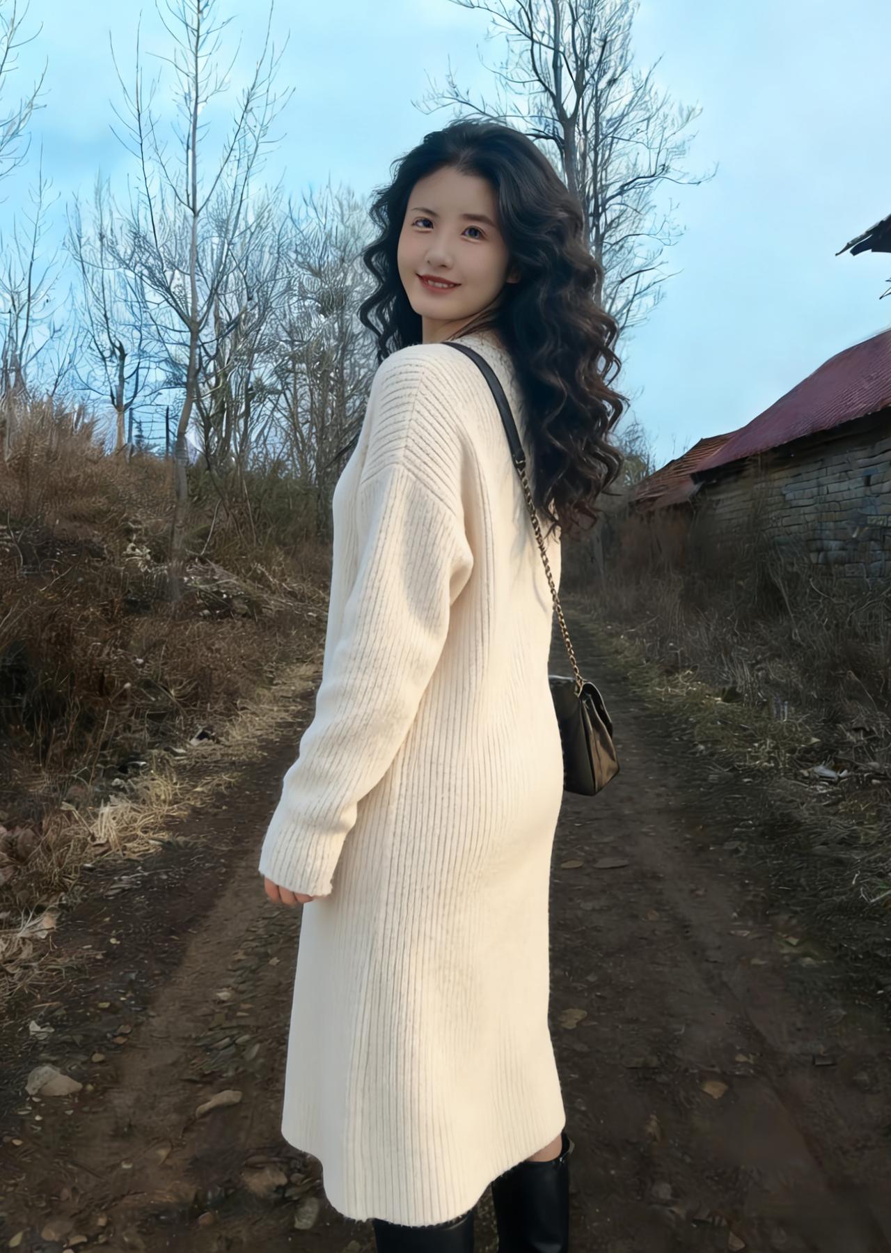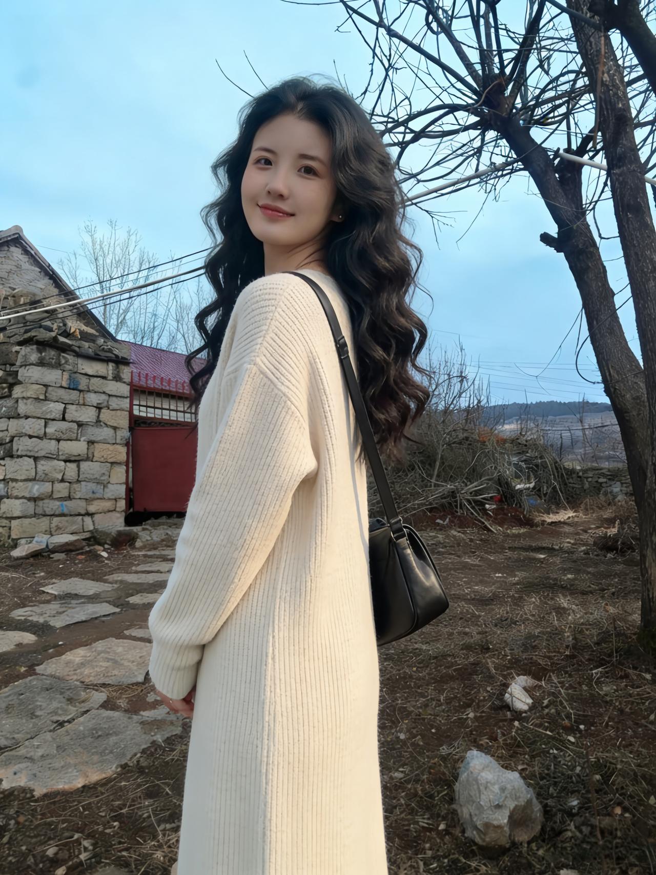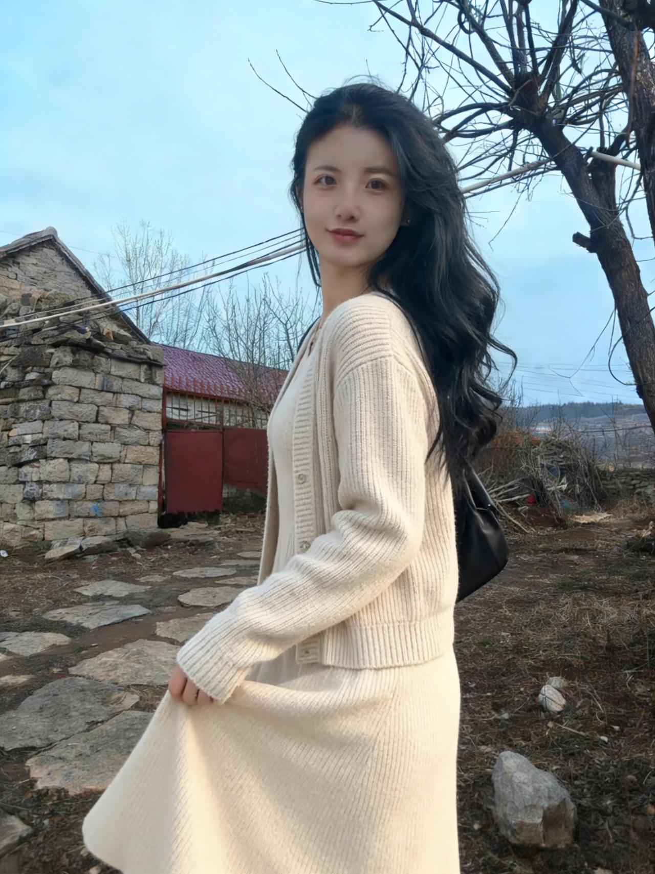 晴空淡淡映芳姿,俏立村头意自迟。 一袭针衫尘不染,风梳发尾惹相思。
