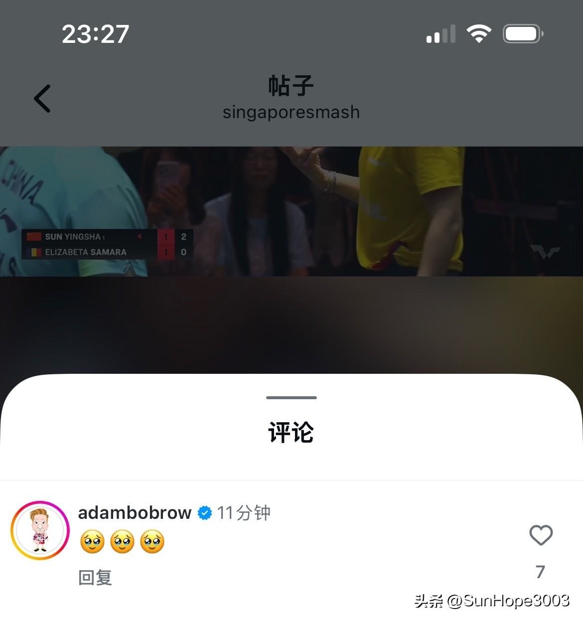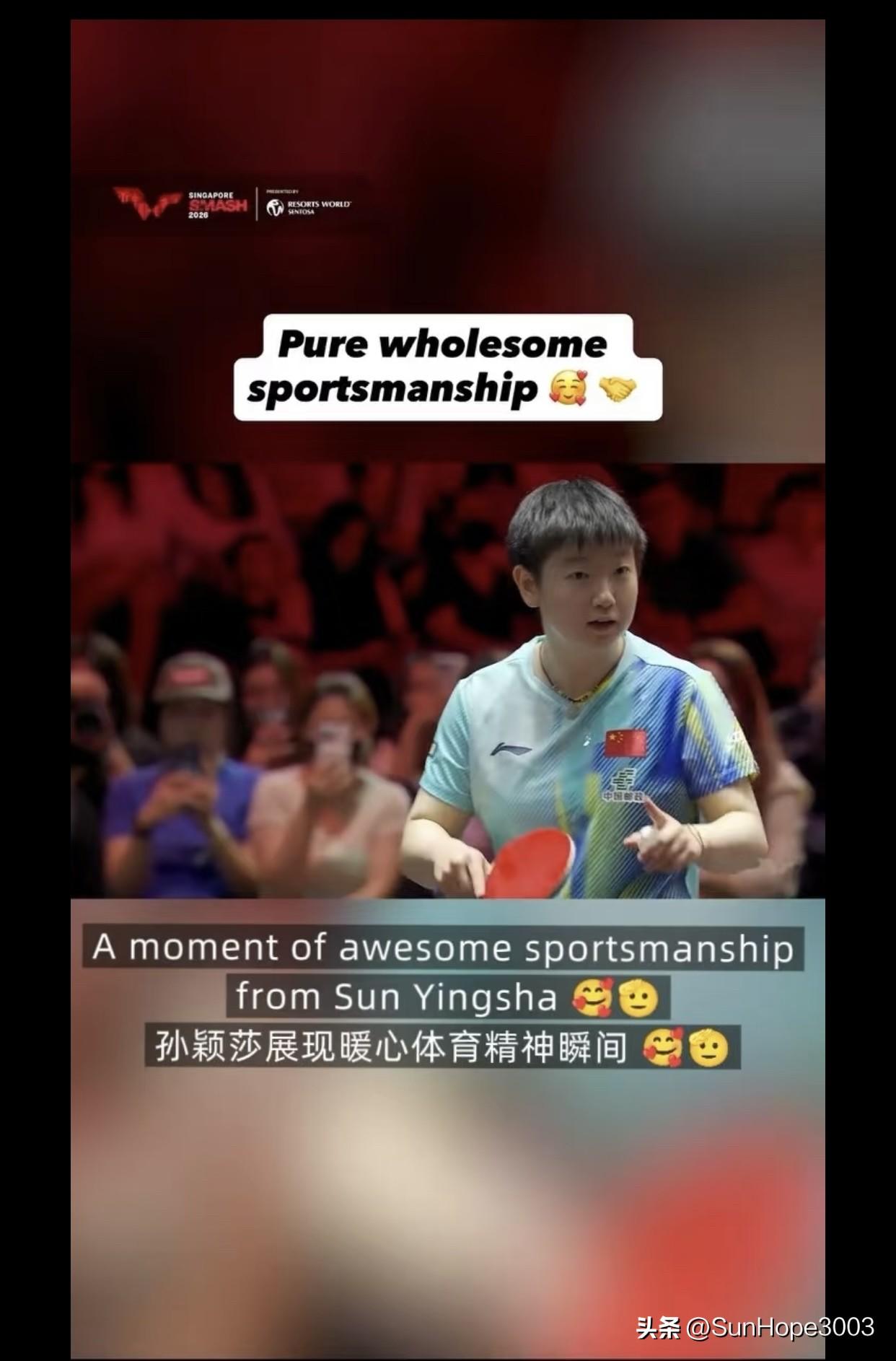 新加坡大满贯官方连发两条信息,盛赞孙颖莎的球品,乒乓球外协球员们点赞和转发, 萨马拉本人也在转发和评论。 新加坡大满贯1/16决赛,孙颖莎3-1萨马拉, 其中有一个球,裁判认为萨马拉发球高度不够,将一分直接判给了孙颖莎, 萨马拉给裁判理论,应该先警告,不能直接罚分, 是莎莎主动提醒萨马拉,申请鹰眼挑战, 最后把这一分要了回去。 ww解说说,是莎莎把这一分送回去了。 Adam大喊,天呢,孙颖莎,这是孙颖莎。 周冠达:孙颖莎挺热心。