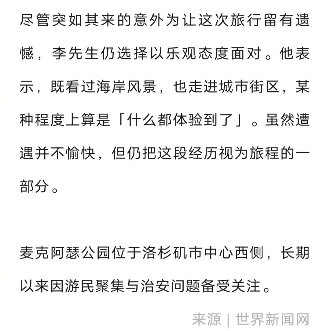 60多岁的中国游客李先生春节期间到美国旅游,在酒店附近有一片游民聚集区走过时,突然有人将一罐未开封的罐头朝其头部前方砸来。另有二至三人上前围堵,将其推倒在地并踢踹,过程中抢走了他的手机! 李先生觉得挨打也是体验,少了这一体验,这趟旅行就不完美了,在国内体验不到的,在国外体验到了,他以为“什么都体验到了”,其实旅个游十天半月的根本远远不够,不如直接在美国体验一下斩杀线岂不是更好?[允悲]