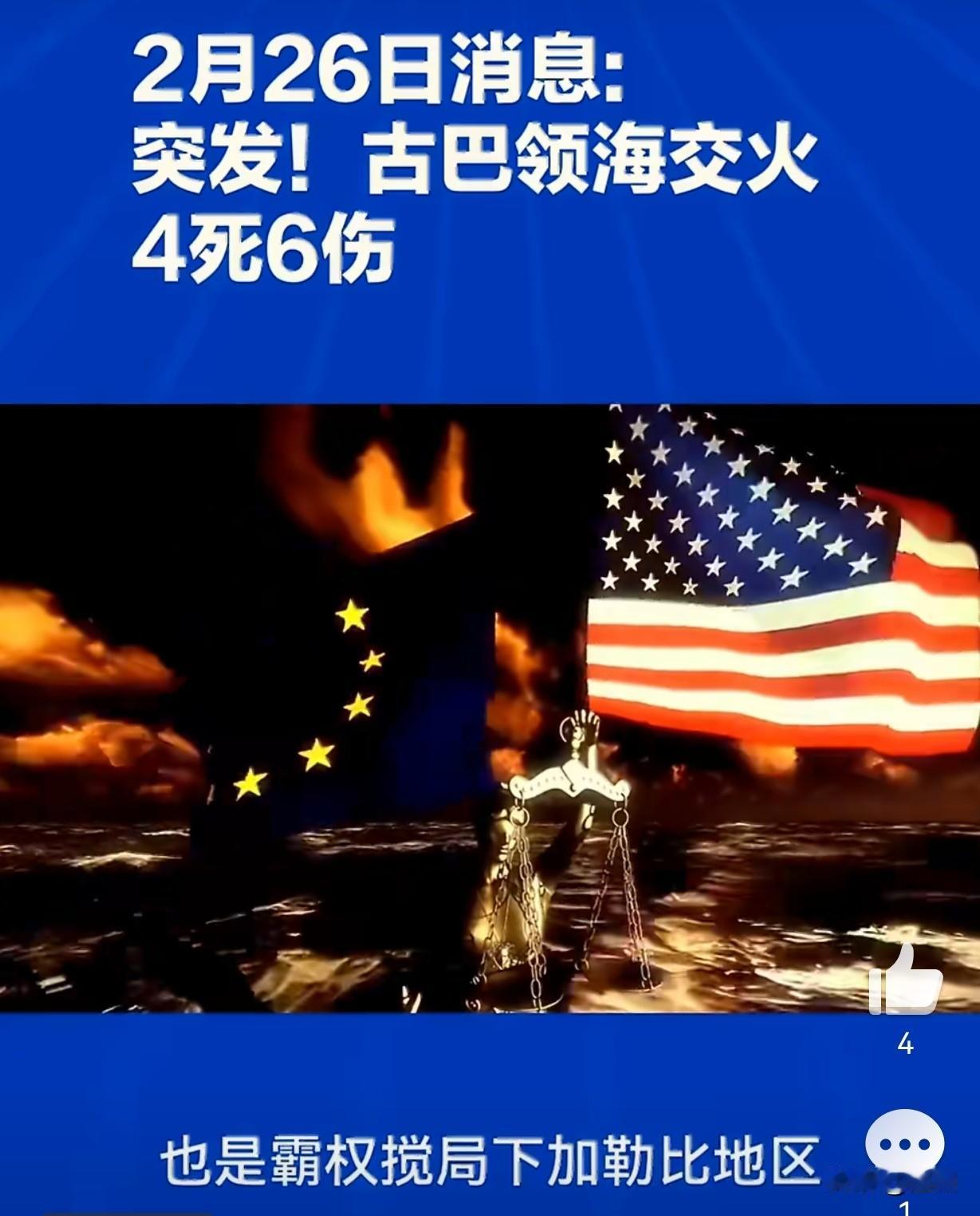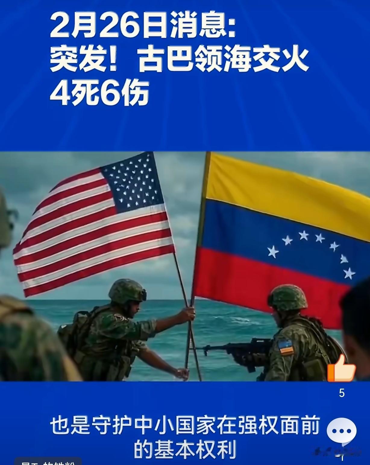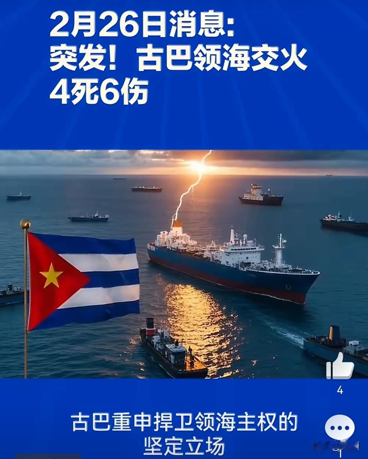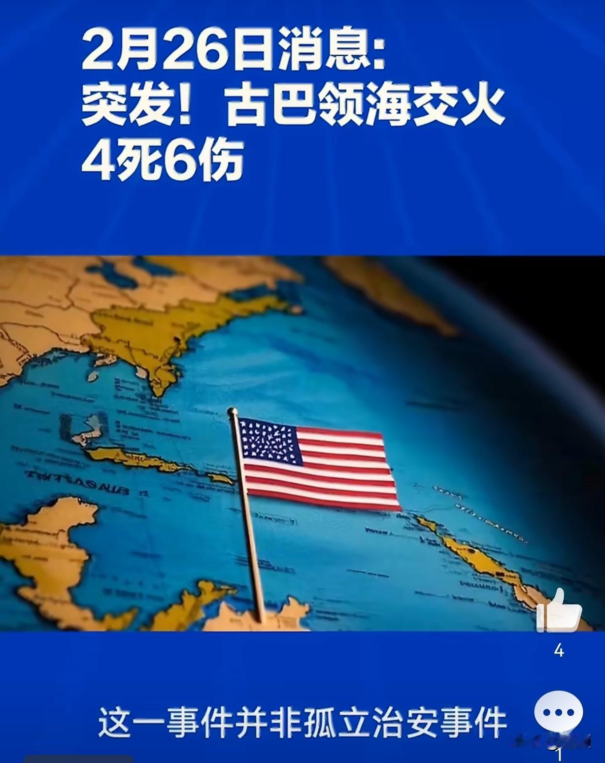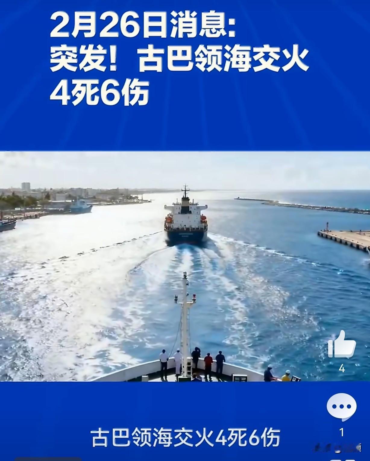 突发!美古海上交火4死6伤…当地时间2月25日,古巴内政部官宣:古巴边防巡逻艇在中部海域,遭一艘美国佛罗里达注册民用船只率先开枪袭击,造成古方指挥官受伤。 古方被迫还击,导致船上4人死亡、6人受伤,伤者已送医。目前古巴未公布死者国籍,美国方面暂未正式回应。 耐人寻味的是1996年2月24日,古巴击落美民间飞机,同样4死。 如今交火恰好发生在这一事件30周年次日,历史惊人重合,美古本就紧张的关系再添火药味。 消息称,该船并非美军或海警,疑似民间船只前往古巴接亲属。 近期美国持续封锁古巴,古巴能源、物资短缺,不少人试图离境,这类民间越境行为频发,极易擦枪走火。 古巴强硬表态:将坚决捍卫主权与领土完整,绝不退让。 美国还在核实人员身份与事件经过,后续是否升级制裁、外交对抗,值得高度警惕。