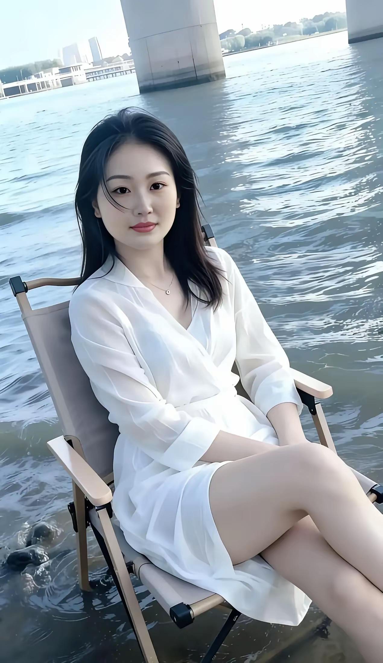 水边闲坐,邂逅温柔晚风🌊 搬椅至浅滩,让水流漫过脚边,清凉将人环绕。一袭白裙于水光中更显轻盈,风抚发梢、撩动裙摆,连呼吸都温柔了。 远处桥与城市轮廓渐模糊,此时唯有水声、风声与心跳。不赶时间、不必迎合,自在便是最佳状态。 水边花影