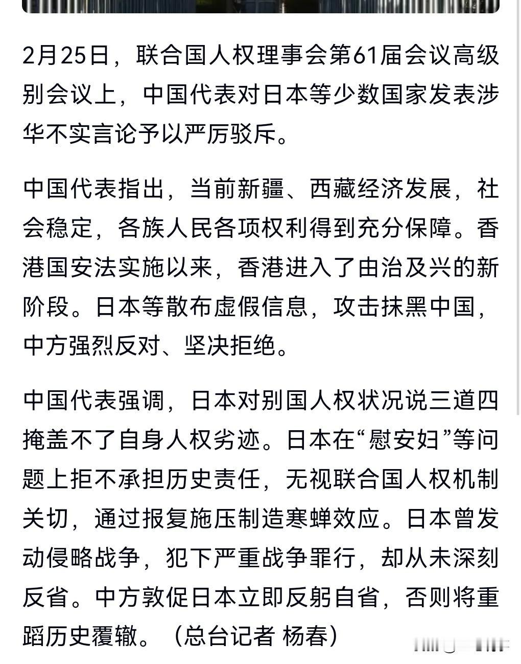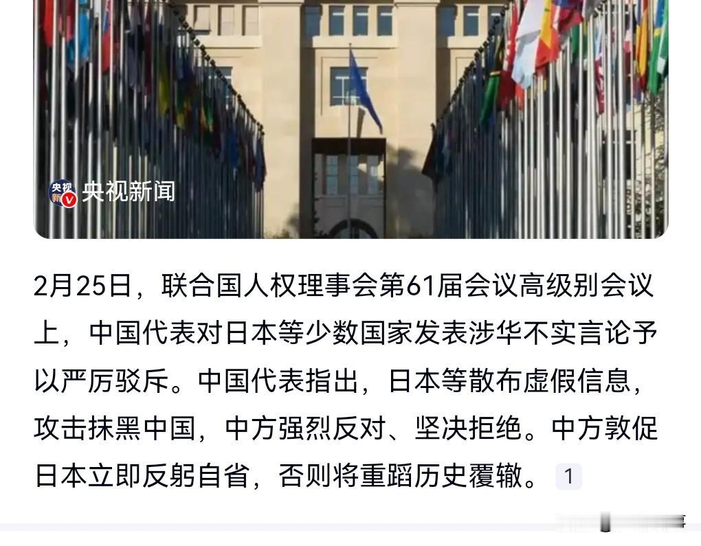 日本太没底线了。 日本等少数国家恶意造谣、抹黑中国,非常的可恶。 2月25日,联合国人权理事会第61届会议高级别会议上,中国代表对日本等少数国家发表涉华不实言论予以严厉驳斥。 中方指出,日本等国攻击抹黑中国,中方强烈反对、坚决拒绝。中方希望日本立即反躬自省,否则将重蹈历史覆辙。 日本一时半会是绝对改不了的。