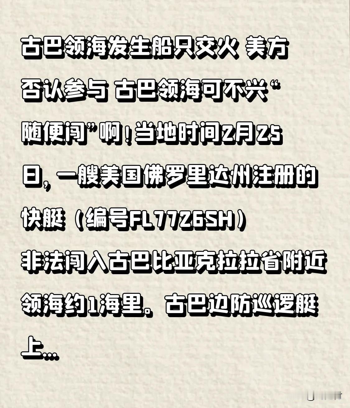 古巴领海发生船只交火 美方否认参与 古巴领海发生船只交火,美方否认参与 当地时间2月25日,一艘编号为FL7726SH、在美国佛罗里达州注册的快艇,非法闯入古巴比亚克拉拉省附近约1海里领海。古巴边防巡逻艇上前核查,却遭艇上人员率先开火,古方巡逻艇指挥官受伤。古方果断还击,交火造成对方4死6伤。 美国国务卿鲁比奥否认有美国政府人员参与,称这是“极其罕见”事件。佛罗里达州总检察长宣布启动调查。此事加剧了古巴和美国间的海上安全紧张局势,后续调查结果如何,让我们拭目以待。古巴领海不容侵犯! 古巴地图 古巴风云