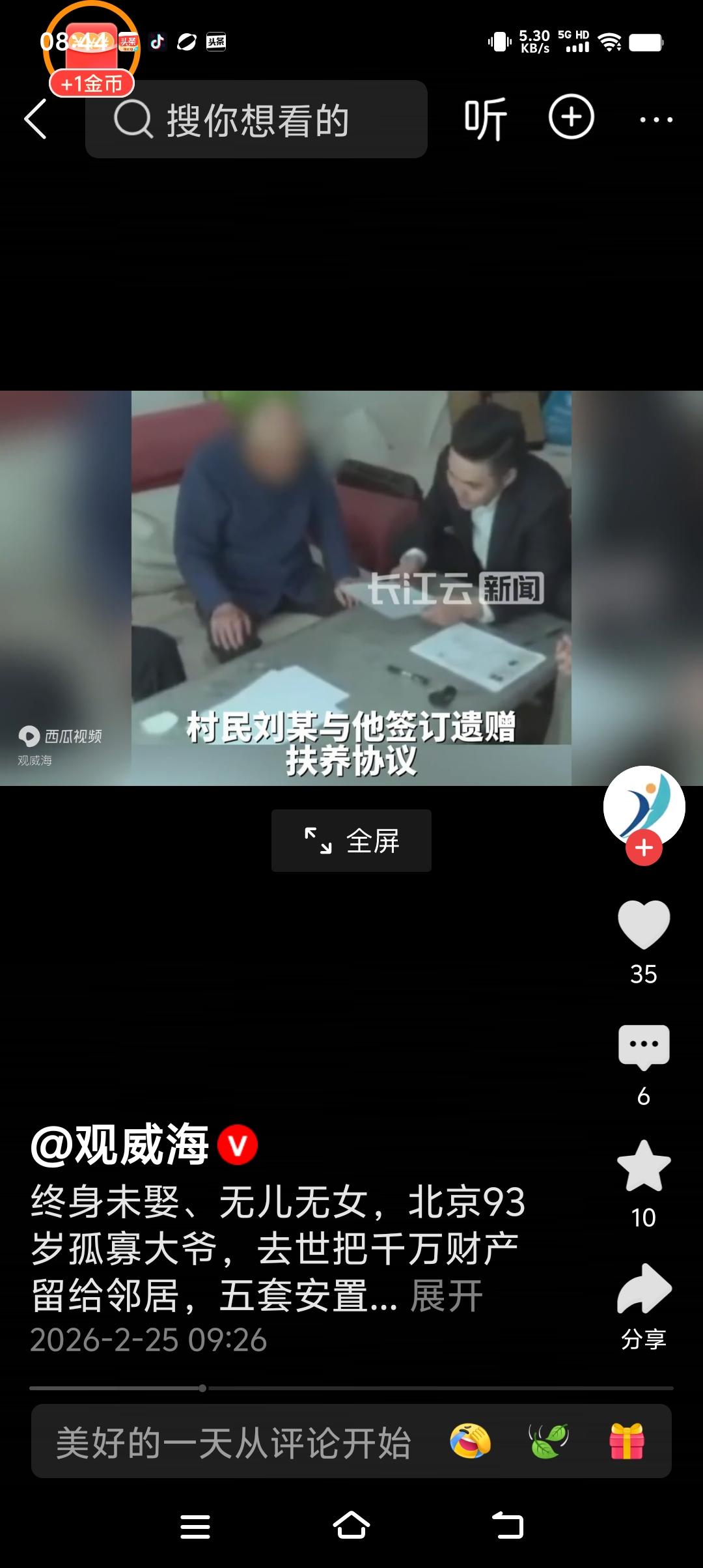 千万遗产留给邻居! 北京93岁的老人,把自己的千万遗产留给邻居,这到底是怎么回事? 93岁的阮大爷 一辈子无儿无女终身未娶, 他与邻居刘某一家相处的特别好, 虽然远大爷有哥哥姐妹,可是他们关系一般, 来往的很少, 反而他与邻居刘某一家却处得像一家人一样! 阮大爷年纪越来越大,经过村委会协调, 刘某同意照顾阮大爷的生活,阮大爷欣然接受,2011年阮大爷家的房子动迁,给了300多万拆迁款, 又给了五套住房!阮大爷一下变成了千万富豪! 2023年经过公证,阮大爷继续接受刘某的照顾, 刘某也是很愿意照顾阮大爷的生活! 阮大爷93岁离开了, 经过法院判决, 阮大爷的家产上千万,都由刘某继承! 阮大爷虽然一辈子没有亲人陪伴, 但是他却遇到了一位好邻居,刘某一家就像亲人一样,陪伴着他度过了晚年时光, 老人很长寿, 这足以说明照顾他的邻居也是无微不至的!不是亲人胜似亲人! 说句到家话,虽说金钱不是万能的,但是没钱真是万万不能的,尤其人老了,钱是老人最后的底气! 但话又说回来,虽然老人很有钱,如果换了心肠不好的人,即便答应对老人的照顾,但是不用心侍候老人,阮大爷也不能这样长寿! 真是好人遇到了好人,两好合一好!爱与爱的相遇总是那么美好!