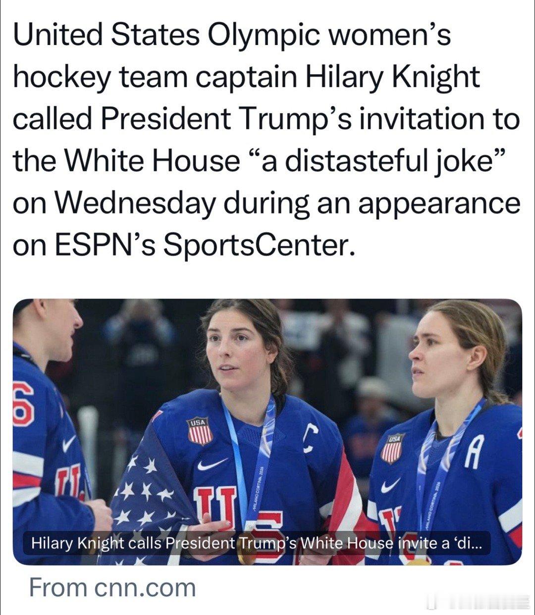 美国女子冰球队队长,在ESPN接受采访时,称Trump请她们去白宫“令人反感、简直是笑话”
