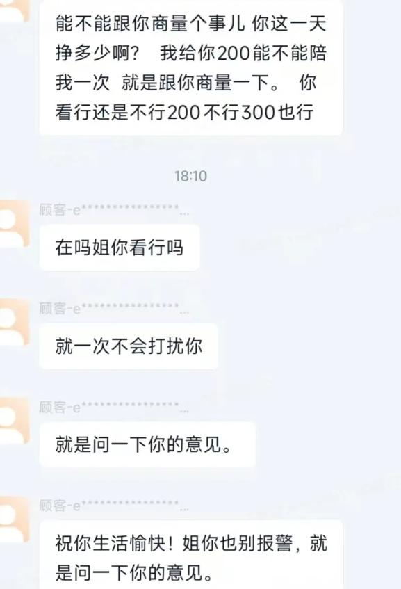 上海,00后女骑手爬上5楼,发现男子在等她,她把外卖交给他就走了,转头就收到男子的信息:给你200能陪我一次不?不行300也行。半小时一连发了57条信息问女子行不行?可女子心情被影响,送餐路上差点出车祸,女子大怒警告他,已报警,这下男子怕了,结果悲剧了。   “给你200能陪我一次不?不行300也行。”上海,00后女骑手小葛刚送完一单外卖,手机就震个不停。她点开一看,是刚才那个收外卖的男子发来的。五分钟前,她刚爬上五楼,气喘吁吁地把餐盒递到他手上。现在,对方就开始讨价还价了。   小葛没回,把手机揣进口袋,骑上电动车赶往下一单。可手机还在震,一条接一条。红灯前她瞥了一眼:又是他。“行不行?”“考虑一下?”“你开个价也行。”   她深吸一口气,告诉自己别理这种人,专心送餐。可那些字眼像苍蝇一样在脑子里嗡嗡转,甩都甩不掉。   送餐路上,她正经过一个路口,手机又亮了。她下意识低头扫了一眼,就这一秒钟的走神,一辆轿车从侧边擦过来。她猛捏刹车,车身一歪,差点摔进车流里。   心脏砰砰直跳,手还在抖。那一刻,怕和怒一起涌上来。   她把车靠边停稳,掏出手机,从头翻那些消息——半小时,整整57条。从“200行不行”到“300也行”,从“就一次”到“你别不理我”,一条比一条急,一条比一条恶心。   “我要报警。有人骚扰我,发了几十条信息,差点害我出车祸。”她截了图,拨了110。   电话那头,接线员记下了情况。很快,民警联系了她,约好时间让她来所里处理。   而男子听说小葛报警,突然慌了。他托人传话,说愿意道歉,愿意赔钱,求她别立案。   小葛去了派出所后,在民警陪同下,和那个男人面对面坐下。这时候她才知道,对方是个20岁的小年轻,比她大不了多少。   “对不起,我就是一时冲动……”男子低着头,说话磕磕巴巴。   小葛没吭声。她想起那57条消息,想起那个差点撞上的路口,想起自己心跳到嗓子眼的那几秒,心中止不住的反感。   民警问她想怎么处理。她说,不要赔偿,就想让他长个记性。可男子执意要赔,掏出300块钱放在桌上,说是道歉的诚意。   而小葛想了想后,收下了钱。但她表示绝不是稀罕这300块,是她觉得:“他做错了事,不能零成本就摆平。”   不过,让人大跌眼镜的是,男子以为钱赔了,事就了了。出警局后,还贼心不死,临走时,他还试探地问:“姐,要不我请你吃个饭?”   小葛愣了一下,直接拒绝:“不可能。”   300块钱可能还是没买来一个教训,但57条消息差点买走一条命。   说到底,这事荒唐在哪儿?荒唐在有人把骚扰当成“搭讪”,把死缠烂打当成“诚意”。他以为发几条消息、报个价,就能换来一次机会。却没想过,那些消息会给对面姑娘造成一生的阴影。   有些底线,不是拿钱就能踩的。200块不行,300块也不行,再加码更不行。   每个女孩的尊严都不是拿来讨价还价的,钱能买到很多东西,但买不来尊重。做人得有点分寸感,别拿骚扰当执着。而守不住边界的人,终将被法律教育。 对此您有什么看法?欢迎大家到下方评论区留言共同讨论。 信息来源:九派新闻《女骑手遇男顾客骚扰后报警,顾客道歉并主动赔偿300元 》 文|灰度场 编辑|南风意史