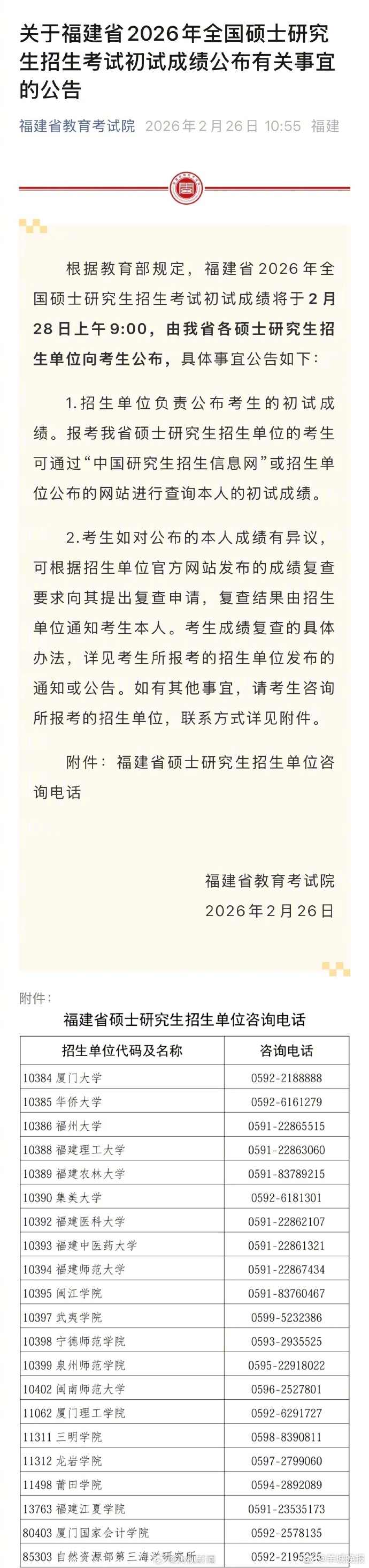 #多地28日考研查分#【2026考研查分时间公布转给考生!祝大家取得理想成绩!】记者从多地教育部门获悉,各研究生招生单位已基本完成2026年全国硕士研究生招生考试初试阅卷工作。#2月28日起考研成绩陆续公布#,目前,广西、吉林、辽宁等地已发布初试成绩查询通知。#考研成绩#主要查询途径戳图↓↓祝考生取得理想成绩!我们一“研”为定!戳更多>>#辽宁确认2月28日公布考研成绩##教育局回应中学早5晚11超长作息表##四六级查分入口#(央视新闻)(编辑:郑宗敏;审签:谢杨柳)