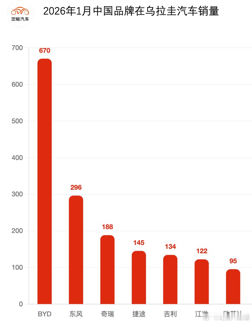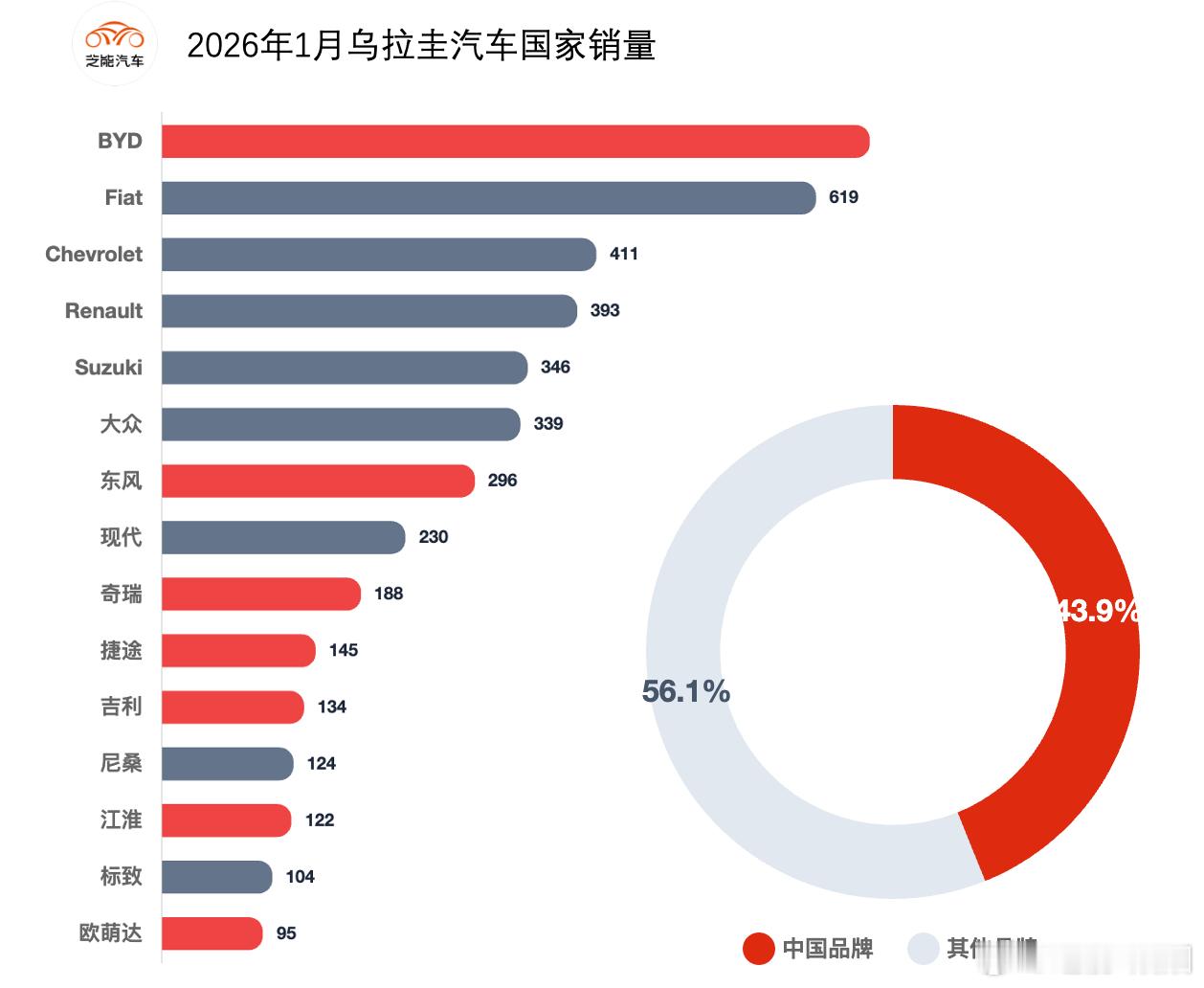 2026 年 1 月乌拉圭车市保持高增长,中国品牌表现堪称强势,整体份额接近一半,同比大幅提升。
