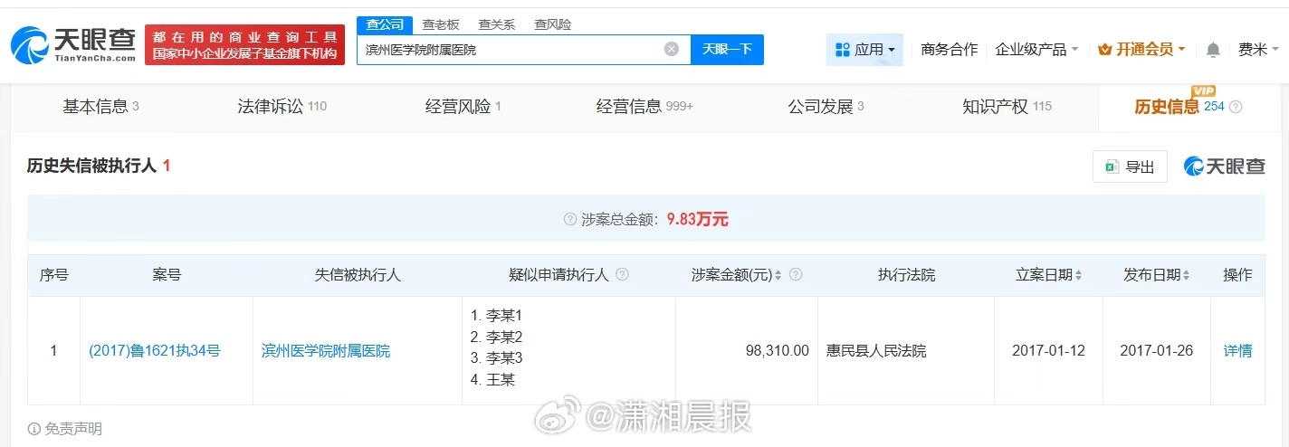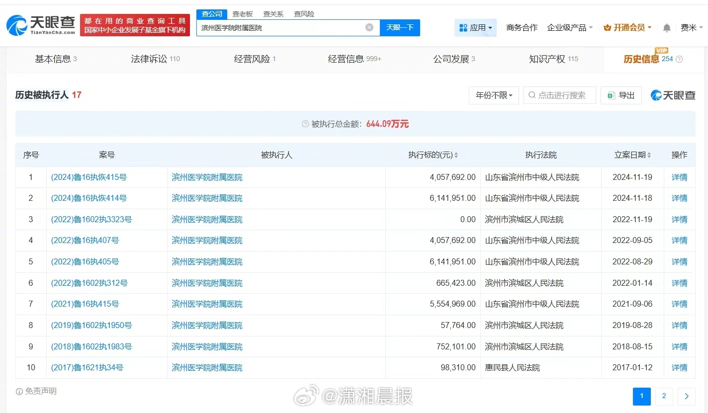 【#滨州医学院附属医院曾被多次强制执行#,#滨州医学院附属医院涉医疗损害纠纷#】#试管婴儿出生右脚缺4趾产检未发现#据媒体报道,山东一对夫妻在滨州医学院附属医院做试管婴儿,妻子于大年初四诞下一名男婴,但宝宝的右足缺失4个脚趾。对此,滨州市卫健委工作人员告知,已就此事展开调查。记者查询天眼查发现,涉事医院滨州医学院附属医院法定代表人为王玉玖,开办资金约8.3亿人民币,宗旨和业务范围为面向社会提供医疗、预防、保健、康复服务,开展临床教学和医疗科研,培养卫生专业人才,法律诉讼信息显示,该医院曾因医疗损害责任纠纷、医疗损害赔偿纠纷、医疗服务合同纠纷等被起诉。历史信息显示,该医院曾存在被执行人、失信被执行人(老赖)信息。 滨州