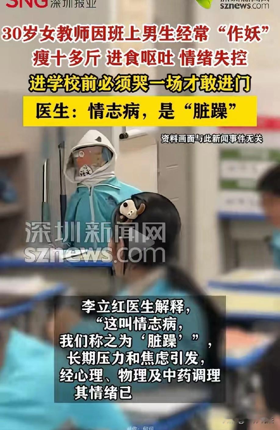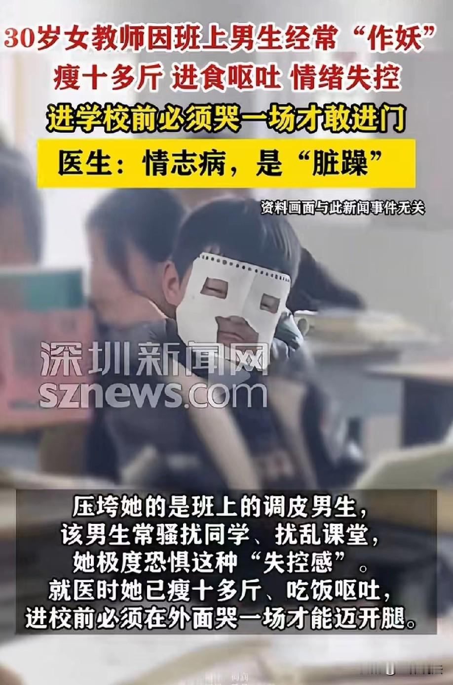 太难了!浙江,30岁女教师班上有个非常调皮的男生,不服从管理,经常在课堂上“作妖”搞怪,严重扰乱课堂秩序。现在的孩子打不得说不得,女教师对其实在头疼,在长期压力和焦虑下,她一下子瘦了十多斤,每次吃饭都呕吐,每天进学校前必须偷偷的哭一场才敢进门。网友:现在的老师真的太难了! 30岁的张女士是一名有着七八年教龄的女老师,原本热爱讲台的她,怎么也想不到,自己会被班上一个调皮的男生逼到身心俱疲,最后只能请假去医院看病。 事情要从她带的这个班级说起,班里有个男生特别调皮,几乎是全班公认的“问题学生”。 他上课从来不肯安分,总是故意搞怪、“作妖”,一会儿接话茬捣乱,一会儿影响周围同学听课,严重扰乱正常的课堂秩序。 不仅如此,他还经常骚扰同学,不管老师怎么提醒、怎么教育,他都当成耳旁风,依旧我行我素。 现在的教育环境下,老师对学生打不得、骂不得,更不能有过激的管教方式。 张女士只能耐着性子反复沟通、讲道理,可所有办法在这个男生身上都不起作用。 课堂一次次被打断,教学节奏被打乱,看着其他同学无法安心学习,再想到家长和学校的期待,张女士心里又急又无奈,却又无计可施。 最让她痛苦的,是那种深深的“失控感”。作为老师,她管不住学生,镇不住课堂,觉得自己特别失败。 这种无力感日复一日地压在她心上,让她越来越焦虑、越来越压抑。 每天一想到要去学校面对那个学生,张女士心里就充满恐惧,甚至开始害怕走进校门。 长期的精神压力,慢慢拖垮了张女士的身体。短短一段时间里,她硬生生瘦了十多斤。 以前正常吃饭、生活,后来只要一吃东西就忍不住呕吐,胃口越来越差,身体也越来越虚弱。 可即便这样,她还是咬牙坚持上课,不想耽误学生的课程。 每天早上,张女士都要经历一番痛苦的挣扎。还没踏进学校大门,她的情绪就先绷不住了。 为了能强撑着走进教室、站上讲台,张女士只能在校外偷偷躲起来哭一场,把委屈、压力和恐惧全都发泄出来。 等情绪稍微平复一点,再擦干眼泪,装作没事人一样走进学校。 这样的日子,她熬了一天又一天。 春节假期结束返校后,张女士的精神和身体都到了极限。 面对依旧调皮捣蛋、毫无改变的男生,再加上堆积已久的压力,她彻底崩溃了,再也无法像以前那样硬撑。 看着乱糟糟的课堂,想到自己日夜煎熬的状态,她终于意识到,自己不能再这样硬扛下去了。 在家人的劝说下,张女士放下工作,来到医院就诊。 医生听完她的情况,又做了详细检查,最终诊断她得的是情志病,中医上叫作“脏躁”。这种病不是身体器官出了问题,而是长期精神紧张、压力过大、情绪焦虑引发的身心问题。 因为长期被学生困扰,又找不到解决办法,负面情绪越积越多,才导致她体重骤降、进食呕吐、情绪失控。 确诊后,张女士开始接受系统治疗,医生为她制定了心理疏导、物理治疗和中药调理相结合的方案。 在专业的帮助和充分的休息下,她紧绷的神经慢慢放松下来,不再被恐惧和焦虑包围,情绪也逐渐平稳。 看到这一幕,不少人都特别心疼张女士,纷纷感叹:现在的老师真的太难了!既要教好书,又要管好复杂的学生,还要面对各种约束,稍有不慎就身心俱疲。 大家也希望,调皮学生的问题能得到更多重视,让认真负责的老师,能少受一点委屈,多一份安心。 《中小学教育惩戒规则(试行)》第七条规定:学生有下列情形之一,学校及其教师应当予以制止并进行批评教育,确有必要的,可以实施教育惩戒: (一)故意不完成教学任务要求或者不服从教育、管理的; (二)扰乱课堂秩序、学校教育教学秩序的。 本案中,男生长期不服从管理、课堂搞怪、骚扰同学,属于故意扰乱课堂秩序、不服从教育管理,教师依法有权当场制止、批评教育,必要时可实施合规教育惩戒。 女教师长期不敢管、不愿管,并非法律不允许,而是对惩戒边界存在顾虑。 该规则明确赋予教师管教权,合法适度的管理不属于体罚或违规,学校应当支持教师正当履职,避免教师因怕担责而陷入精神内耗。 《民法典》第一千一百八十八条规定:无民事行为能力人、限制民事行为能力人造成他人损害的,由监护人承担侵权责任。监护人尽到监护职责的,可以减轻其侵权责任。 学生长期扰乱课堂、持续侵害教师心理健康,导致教师体重骤降、进食呕吐、情绪崩溃,已构成民事权益损害。 未成年学生侵权,由其监护人承担侵权责任。 学生教育从来不是老师一个人的事,家长未履行家庭教育与监护义务,这才是矛盾长期激化的重要原因。 张女士可就身心健康损害,依法向学生监护人主张赔礼道歉、赔偿损失等民事责任,用法律途径维护自身权益,而非独自承受压力。