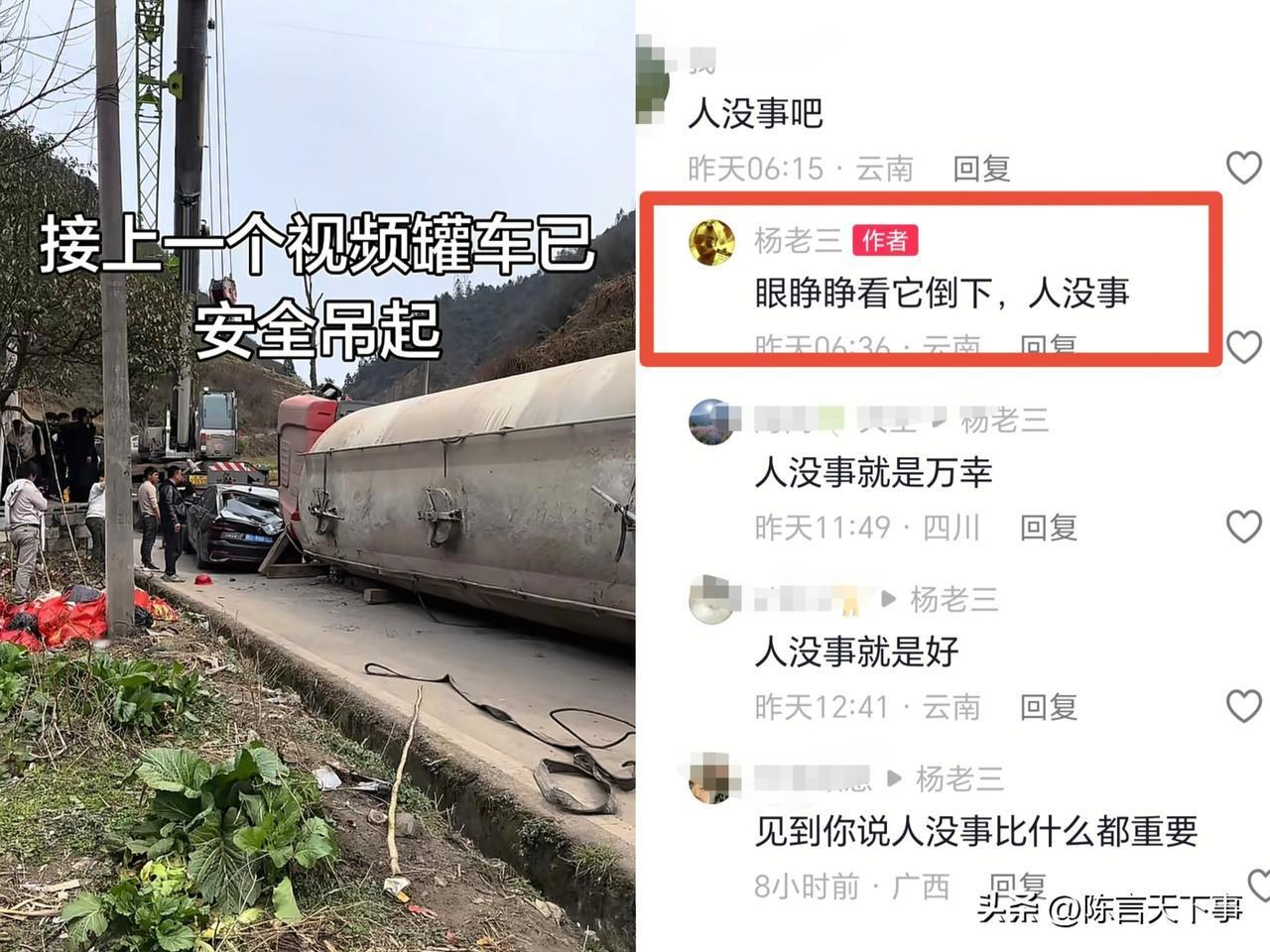这黑车司机能逃过一劫也算命大了!云南昭通,一辆槽罐车在上坡时因刹车失灵发生后溜,紧随其后的一辆黑色轿车为了避险倒车,但由于罐车后溜速度太快,最终撞上停在路边的一辆白色轿车和倒车的黑车后发生侧翻,庆幸的是人没有事。 据知情人士杨老三通过家用监控拍摄到的画面分享,该事件发生2月24日,槽罐车在发生刹车失灵后,司机感觉到不妙提前弃车逃跑了,而停在路边的白色轿车也没有人在,后方倒车的黑色轿车虽然被槽罐车压到车尾,但司机并没有因此受到伤害。 目前,杨老三也更新后续视频,槽罐车已经被前来救援的人员安排吊车安全吊起来了,道路也已经恢复正常。 视频在网上曝光后引起不少网友的热议! 有网友看到视频后都替黑色司机捏一把汗,看到当时的场景都在说黑色司机傻,明明旁边有空地可以倒车进去,他非要一直往后倒,能没事也算是捡回一条命。 但也有网友认为,当时的情景换作很多司机都来不及做出反应的,遇到这种事大部分司机帽子是懵的,紧张之下做不出反应很正常。 而且从当时的情况来看,黑色司机应该也是判断不出槽罐车是什么情况,他选择保持车距倒车,估计也是想看一下大车下一步应该怎么走。 不管怎么说,只要人没事就是万幸中的大幸了!