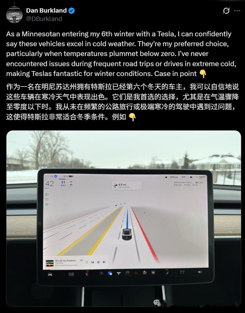 车主DBurkland 表示,在经历六个冬天后,他坚信特斯拉绝对是冬季出行的首选:“尤其在气温跌破零度时,无论是长途旅行还是高频通勤,它从未让我失望。”