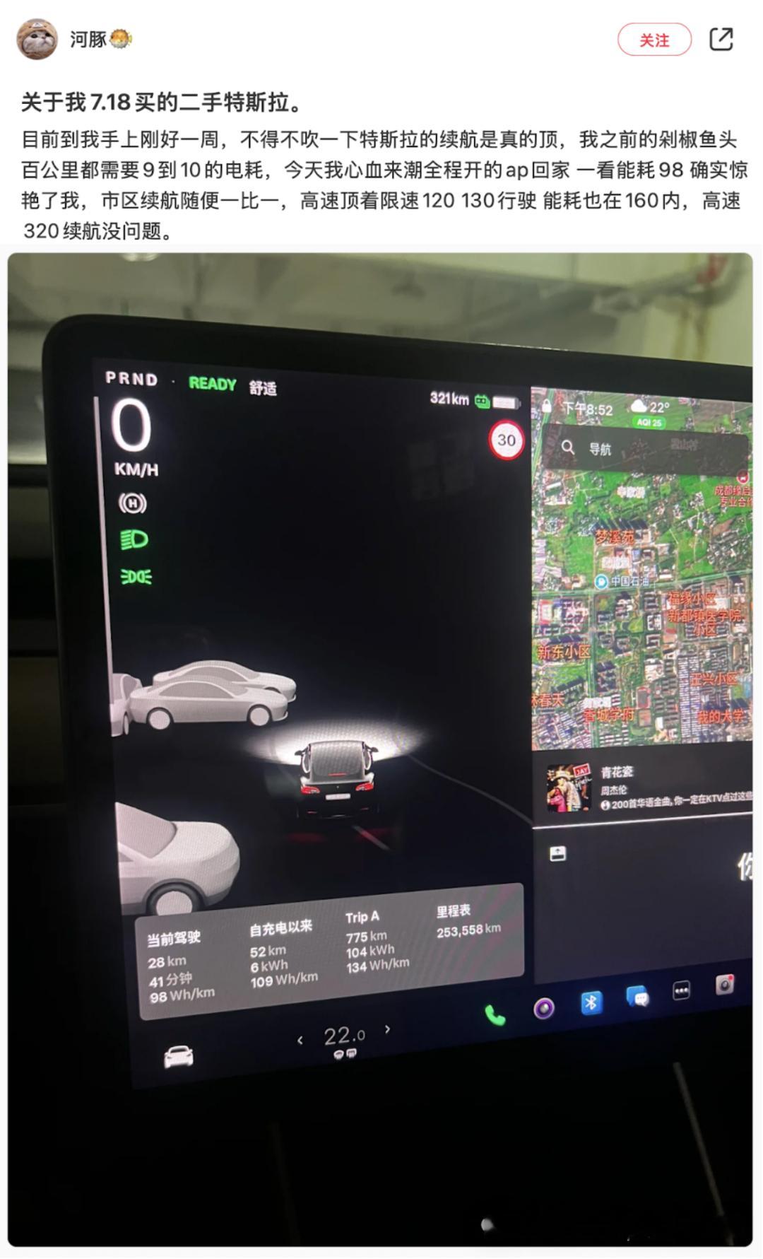 真实车主的反馈也进一步印证了特斯拉三电技术的优势。车主河豚 在分享自身用车体验时表示,自己的二手Model 3在市区行驶时能耗仅98Wh/km,高速按照限速行驶能耗也能控制在160Wh/km以内,极低的行驶能耗让车辆轻松实现扎实续航。