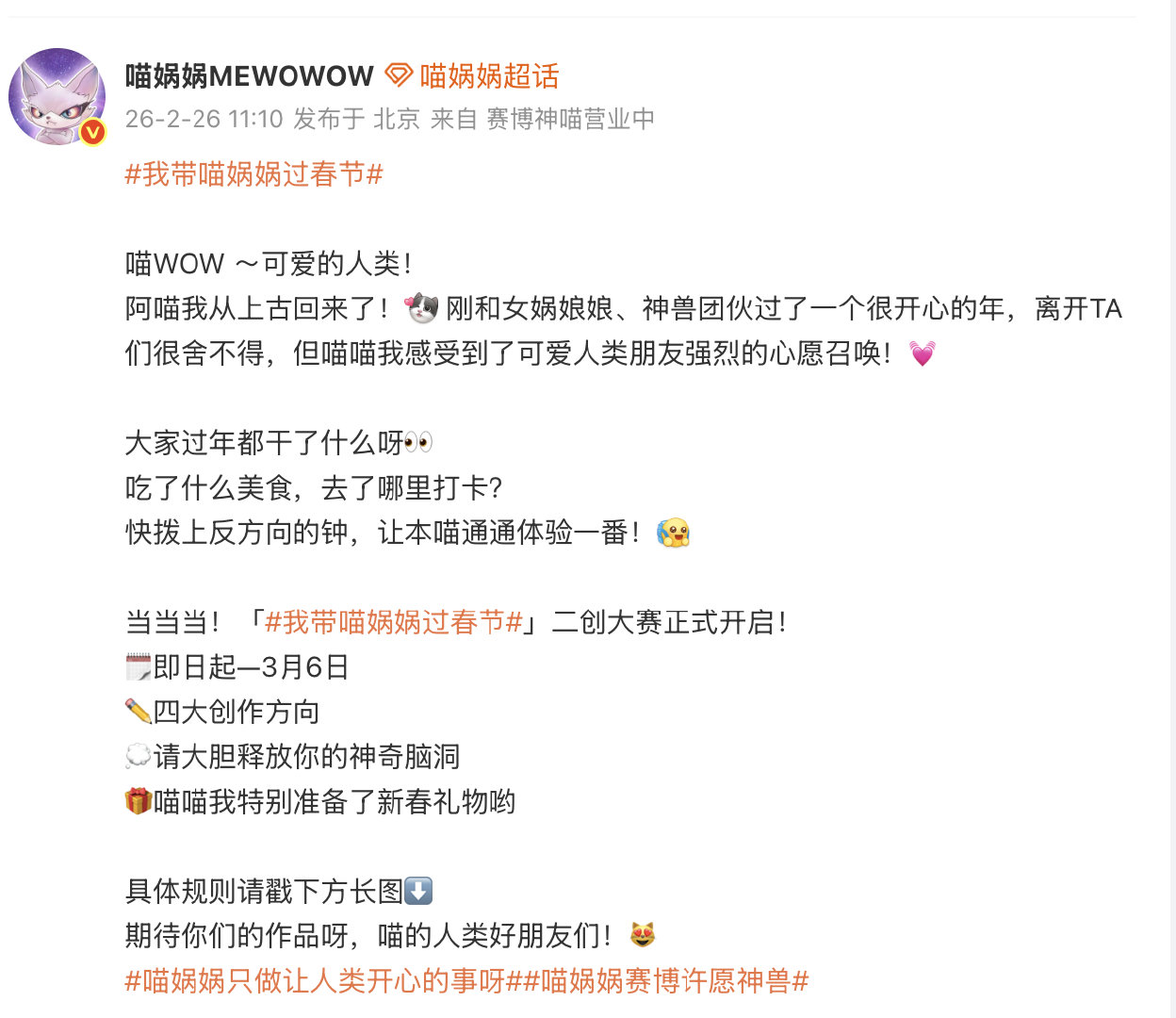 我带喵娲娲过春节 春节最佳搭子已就位!上古神兽喵娲娲邀你参加二创大赛,即日起至3月6日,释放脑洞,让它感受人类过年的热闹与快乐~