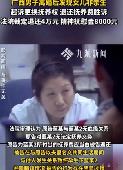不可原谅!广西贵港,男子和妻子离婚后,两个女儿一人抚养一个,他抚养的是二女儿。可随着孩子的长大,男子发现这个女儿和他长得一点都不像,他怀疑女儿不是亲生的,去做了亲子鉴定,结果养了这么多年的女儿,竟是妻子和其他男人所生,男子直接崩溃!他怒将前妻告上法庭,要求前妻退还抚养费,并赔偿精神损失! 蓝某这天心情本不坏,刚刚忙完一天的工作,想着好久没好好陪陪二女儿了,就叫上几个老朋友来家里吃饭。 屋里热闹非凡,饭菜丰盛,笑声、碰杯声混在一起,让人一时忘了外面的喧嚣。蓝某看着两个小女儿在客厅里追逐嬉戏,心里有种难得的温暖和踏实感。 他端起酒杯,对朋友们说:“兄弟们,今天咱们就好好聚一聚,别谈工作,别谈烦心事。” 酒过三巡,气氛也逐渐热络起来。蓝某的朋友李强(化名)脸色有些凝重,盯着蓝某的眼睛,缓缓开口:“老弟啊,我真为你不值。” 蓝某听得一愣,笑着问:“你这话什么意思?不值啥呀?” 李强犹豫了一下,像是下了很大决心,又喝了一口酒才继续说:“你之前没离婚的时候,我不好跟你说,这事儿我憋在心里挺久的……你那前妻杨某,可不是个老实人。” 蓝某的笑容瞬间僵在脸上,他眉头微微皱起,酒杯也握得紧了些:“什么意思?老实人不老实?你到底想说啥?” 李强叹了口气,声音压低,却又带着急切:“你不在家的时候,她经常跟别的男人在外面鬼混……我提醒你,你长个心眼子,这二闺女,跟你长得可不像,到底是不是你的。” 这话像一盆冷水,瞬间浇灭了蓝某心里的暖意。他的视线在女儿身上停留了一秒,二女儿正蹦蹦跳跳地拿着玩具小熊,天真无邪。 蓝某的心里翻起了怒火和防备:“你什么意思?老子前妻的事儿你管得着吗?你这是在挑拨离间吗?” 李强连忙摆手,声音中带着急切和无奈:“老弟,我不是想挑拨你,我是怕你受伤害,我是朋友才说的啊,你自己考虑清楚……” 蓝某一脸冷峻,眼神里已经透着决绝,他突然站起身来,把酒杯重重放在桌上:“够了!我不想听这些!你说的这些,都是猜测,我不要!” 说完,他走向门口,冷声道:“出去吧,我现在不想见你。” 李强面露尴尬和无奈,只得灰溜溜地穿好衣服,握了握蓝某的手,低声说了一句“老弟,你多保重”,便离开了。 门“啪”地一声关上,屋里顿时安静下来,只剩下二女儿的笑声在回荡,显得格外稚嫩而孤单。蓝某长叹一口气,坐回沙发上,看着女儿手里的玩具小熊,心里五味杂陈。 可是随着孩子慢慢长大,一些细节开始刺痛他的心。蓝兰的五官、身高、身材比例,甚至说话的方式、笑声,都和他毫无相似之处。 蓝某心里渐渐生出怀疑,但他不敢轻易说出口——毕竟这是自己养了多年的女儿,他怕一旦怀疑,关系就彻底破裂。 怀疑像一根针,越扎越深,蓝某彻夜难眠。他翻看蓝兰小时候的照片,反复比对自己和女儿的特征,终于下定决心,去做亲子鉴定。 他抱着复杂的心情,把蓝兰带到医院,签署了检测同意书。 结果出来的那一刻,他整个人像被当头棒喝,脑袋一片空白——蓝兰竟然不是自己的亲生女儿。这种发现像洪水般冲击着蓝某多年积累的感情,他崩溃了,泪水止不住地流。 愤怒、背叛、伤心交织在一起,蓝某无法平复内心的波澜。他立即联系律师,将前妻杨某告上法庭,提出诉讼请求:要求退还多年来为蓝兰支付的抚养费,并赔偿精神损失。 法庭开庭那天,蓝某神情凝重,他说:“这几年,我以为自己在养自己的孩子,可事实却完全不同。我受到了欺骗,我的感情和信任被践踏,我要求得到法律的公正。” 经过审理,法院最终作出了判决。蓝兰的抚养权交由杨某继续抚养,蓝某不再承担抚养责任; 同时,法院认定杨某在事实隐瞒中存在过错,应向蓝某返还已支付的抚养费40000元,并支付精神损害抚慰金8000元。 判决书在蓝某手中,他的手微微发抖,心情复杂。 一方面,他为多年的被骗和伤害得到了部分法律上的补偿而稍感宽慰;另一方面,他对自己曾经深爱的孩子无法继续履行父亲的角色,心中仍有挥之不去的失落。