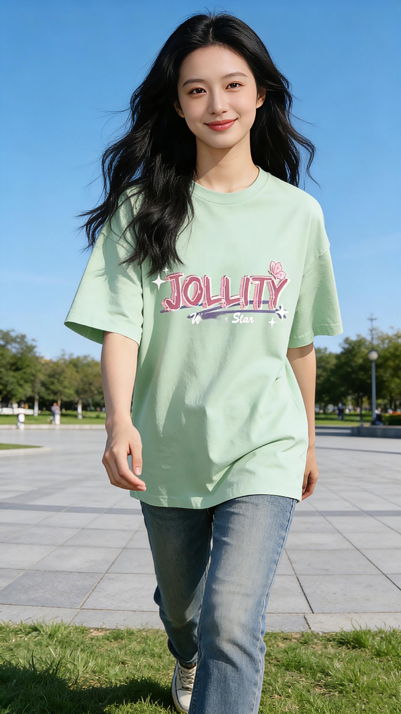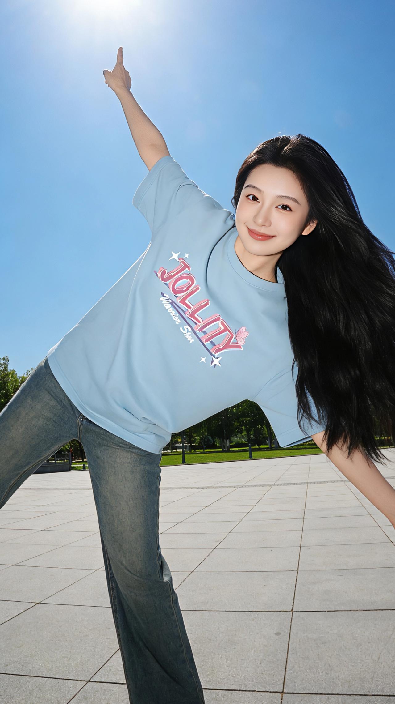 风掠过广场的地砖,把春日的暖意揉进衣料里。 浅绿、粉、黑、浅蓝,四件印着“JOLLITY”的T恤,像把不同的心情穿在身上。她走在青草与石板之间,脚步轻得像要飘起来,长发被风撩起,发梢扫过肩头的印花。 有时双手比心,把阳光和笑意都圈在掌心;有时比出“V”字,对着镜头眨眨眼,像在说“今天也很开心呀”;有时单手指向天空,仿佛要把蓝天和白云都摘下来,装进衣袋里带走。 风停的时候,她站在原地,T恤的褶皱里藏着阳光的温度。广场上的人来人往,都成了背景,只有她和这几件衣服,在春日里轻轻晃动,像一首没写完的诗,每一个动作都是一句温柔的注脚。 早春穿搭 小个子穿搭 打开春季罩衫穿搭思路 穿搭分享