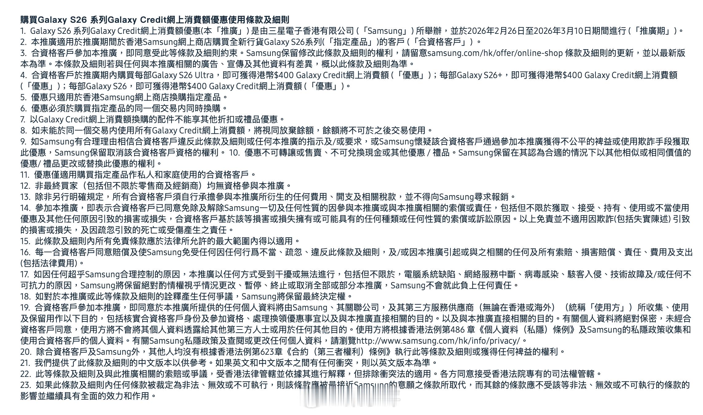 比如S26 Ultra的16+1TB版本是12598港币,约合人民币11020元(国行版12699元),用中银银行卡下单,还返2100港币(约合人民币1837元),还送你300港币配件消费券,首次下载还减100港币等等