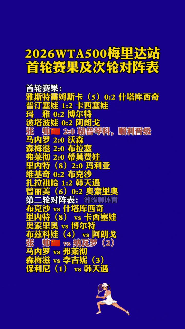 2026WTA500梅里达站首轮赛果及次轮对阵表。 湘泓聊体育。 首轮赛果: ·