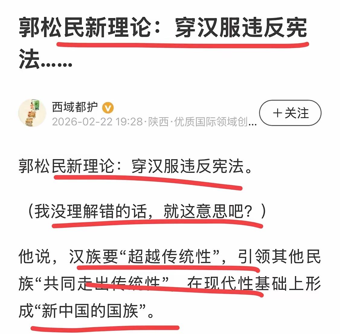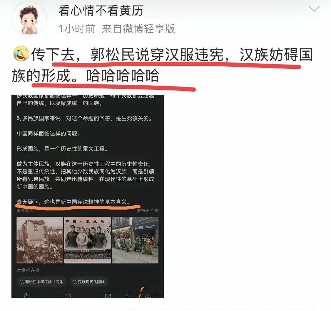 最近因为昆仑策高级研究员郭松民妄议汉服问题,被网友骂到破防,它甚至扬言已经收集证据,要起诉网友造谣! 在我看来,我们中国是一个自由法治社会,你郭松民可以妄议我们汉族文化,我们汉人没有告你,你倒好还来个恶人先告状,这脸皮也不是一般的厚啊!我觉得网友调侃你还是太轻了,我们整个汉族同胞都应该拿起法律武器维护我们汉族文化和汉服,这是几千年来流传下来的文化瑰宝,怎么能容忍你郭松民妄议,你配吗? 如果说穿个汉服就像挖你家祖坟一样,那么我就要问一句了,你到底是什么人?哪里来的?为什么对一个小小的汉服如此忌惮?我觉得像郭松民、北大姓孔的还有胡锡进,这类人有关部门都要好好的查一查,它们到底是什么情况如此忌惮我们穿汉服,我相信它们不是无缘无故攻击和诋毁我们的汉服的,这其中一定有缘由! 我们中国作为一个多民族大国,之所以现在可以团结友爱,就是因为我们汉人作为主体民族,牺牲了很多给少数民族非常大的优待,才能让大家这么和谐有爱!偏偏就是有些别有用心之人,想方设法的挑动矛盾引发对立,面对这种玩意,我们决不能心慈手软,一定要让它们付出代价!
