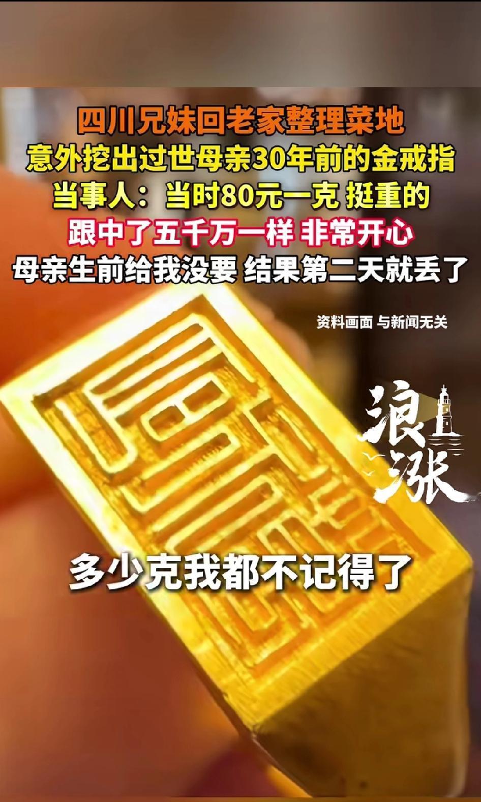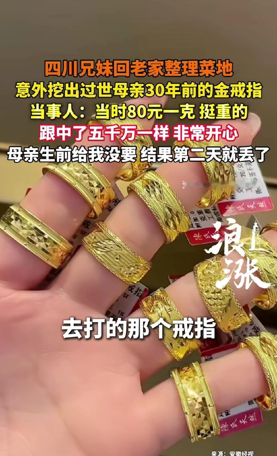 泪目又暖心!四川兄妹回老家整理菜地,竟意外挖出过世母亲30年前遗失的金戒指!当年80元一克,分量很足,妈妈生前给她没要,第二天就弄丢了,如今失而复得,兄妹俩激动得像中了五千万! 2026年春节,四川的老家阳光正好。 刘女士和哥哥妹妹一起回到早已熟悉又陌生的老屋,屋后那块菜地,荒了一年又一年,杂草长得比人膝盖还高,泥土板结发硬,风吹过来,都是小时候熟悉的味道。 她拿起小锄头,蹲下身,一锄一锄慢慢翻地。 指尖沾着凉凉的泥土,鼻尖全是草木与泥土混合的气息,心里一阵阵发酸——要是妈还在,这会儿肯定在旁边念叨:“慢点儿,别累着。” 她一边挖,一边忍不住走神,脑子里全是母亲的样子: 母亲爱笑,手巧,一辈子节俭,舍不得吃舍不得穿,却总把最好的留给孩子。 忽然—— “咔”的一声轻响。 锄头磕到了一块硬东西,不像是石头,也不像树根。 刘女士愣了一下,没放在心上,随手用锄头尖轻轻一挑。 就这一下,一点刺眼的金光,从黑褐色的湿泥里,猛地闪了出来。 心,猛地一缩。 她扔下锄头,手指直接插进凉冰冰的泥土里,颤抖着往外扒。 指甲缝塞满了泥,她浑然不觉,眼睛死死盯着那一点亮。 一层泥,两层泥,三层泥…… 一枚完整的金戒指,完完整整躺在土里,静静躺了30年,等着她。 款式是几十年前最老式的圆戒,边缘被岁月磨得微微发亮,没有花哨花纹,却沉甸甸压手。 只一眼,刘女士整个人僵在原地。 30年前的画面,没有任何预兆,涌进脑海里。 那时候家里条件很苦,金价才80元一克,一枚戒指,是母亲省吃俭用一年多才舍得打的。 她不舍得戴,小心翼翼收着,心里早就认准了: 这是给大女儿的。 那天下午,阳光也是这样的暖。 母亲把她拉到身边,粗糙又温暖的手,轻轻握住她的手,把那枚还带着体温的金戒指,慢慢套进她的手指。 母亲笑得眼睛弯弯: “拿着,娘给你留的,以后嫁人了也有个念想。” 刘女士那时候懂事又害羞,看着母亲自己都舍不得戴的东西,说什么也不肯要,轻轻摘下来,塞回母亲手里,小声说:“妈你戴,我不要。” 她以为,还有下次。 她以为,以后还有机会再收下。 可第二天,戒指就不见了。 母亲那天慌得像个做错事的孩子。 灶台前后、院子角落、洗衣台边、菜地埂上……她一遍一遍找,蹲在地上扒土,腰都酸了,也不肯停。 嘴里反复念叨: “明明放口袋里的,怎么就没了……是留给我大闺女的啊……” 找了一天,两天,半个月…… 戒指像人间蒸发,再也没出现。 那遗憾,刻在母亲的眼神里,记在刘女士的心里,一压就是30年。 她无数次偷偷怪自己: 如果那天我收下了,妈就不会这么难过了。 30年间。 母亲走了,老屋旧了,菜地荒了。 所有人都以为,那枚戒指,永远埋在时光里,再也回不来了。 可谁能想到—— 30年后的这一天,它自己从土里醒了过来。 刘女士把戒指紧紧攥在手心,金子贴着掌心,凉得刺骨,又暖得烫心。 泥土混着眼泪,一滴滴砸在手背上。 她浑身发抖,控制不住地哽咽,声音撕心裂肺,又软得像要碎掉: “这是我妈的……是老娘的戒指啊……” “我就知道……我就知道你还在……” “这比中5000万、1个亿都开心啊——我妈回来了……” 兄妹俩围过来,一看那款式,瞬间全都红了眼,一句话说不出来,只陪着掉泪。 30年风吹、雨打、日晒、霜冻,戒指被埋在黑暗里,却一点没变形、没褪色、没消失。 就像母亲的爱,藏了30年,一分没少,一点没变。 网友看完全纷纷破防: 哪里是挖到戒指,是妈妈换了一种方式,从时光里走出来,把当年没送出去的爱,亲手交给了你。 30年前,她想把最珍贵的留给你; 30年后,她跨越生死,把最疼你的念想还给你。 戒指会遗失,岁月会流逝, 但母亲的爱,永远不会消失。 它只是藏在泥土里,藏在风里,藏在你一回头就能看见的地方,静静等着你! 遗失30年的金戒指 母爱从未缺席 春节暖心故事 三十年后的重逢 世间最美是母爱 消息来源:浪涨新闻及网络公开内容,本文配图/视频素材来自@ 浪涨新闻,以上仅用于内容分享,侵权即删,谢谢! 我是晴风语说事,人情冷暖记录者,持续记录人间的善意与无奈,欢迎大家的关注,谢谢支持!