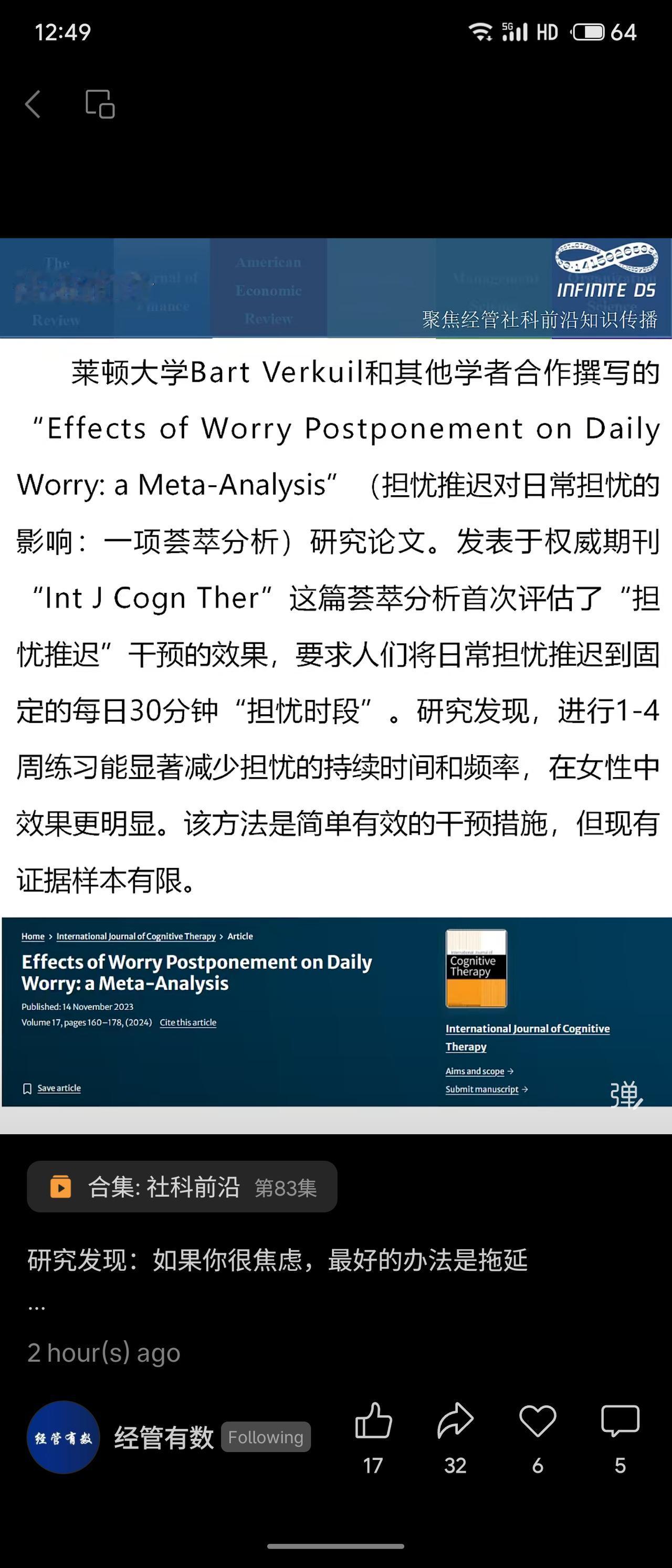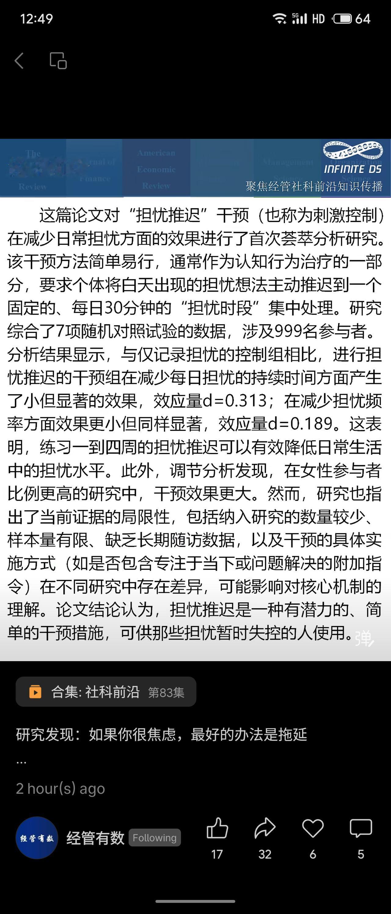 研究发现,缓解焦虑的一个有效方法是“担忧推迟”:将日常担忧推迟到固定的每日30分钟“担忧时段”集中处理。一项涵盖999人的荟萃分析显示,练习1-4周后,担忧的持续时间和频率显著减少,在女性中效果更明显。 这项干预简单易行,但现有研究样本有限,缺乏长期随访数据,并非鼓励拖延,而是有意识地管理焦虑。