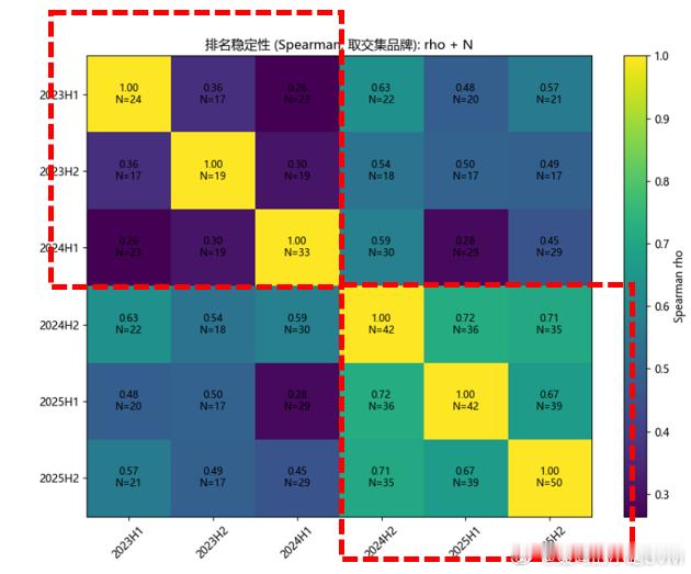 研究了一下杰兰路在过去3年里,发布的6期数据。24年上半年这期,是个断点。这个断点之前,各期之间品牌的分值、排序相关性如左上角,并不是特别稳定。但这个断点之后,各期之间品牌的分值、排序相关项,如右下角,已经有了比较好的呈现。这个期间一般说明了几种情况:1.杰兰路的NPS体系在24年H1做了一次变更,此后体系日臻成熟。2.杰兰路早前数据样本不够,此后调查的市场品牌变多,样本数据也越来越多,数据越来越稳定了。3.市场在24年H1之前是乱战形态,24年H1以后,谁起谁落,已经有了比较清晰的样貌。