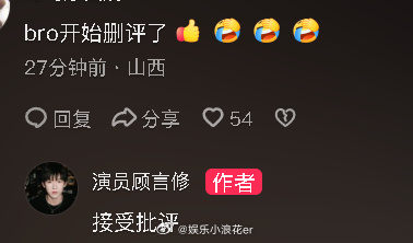 男演员点赞和刘晓庆搭戏是福气 26日,有网友发现男演员点赞和刘晓庆搭戏是工伤的评论后,删除了该评论并且点赞了和刘晓庆搭戏是福气的评论,表示:“接收批评。” 注:该男演员不是和刘晓庆合作短剧的男主角金珈,而是男配角顾言修。