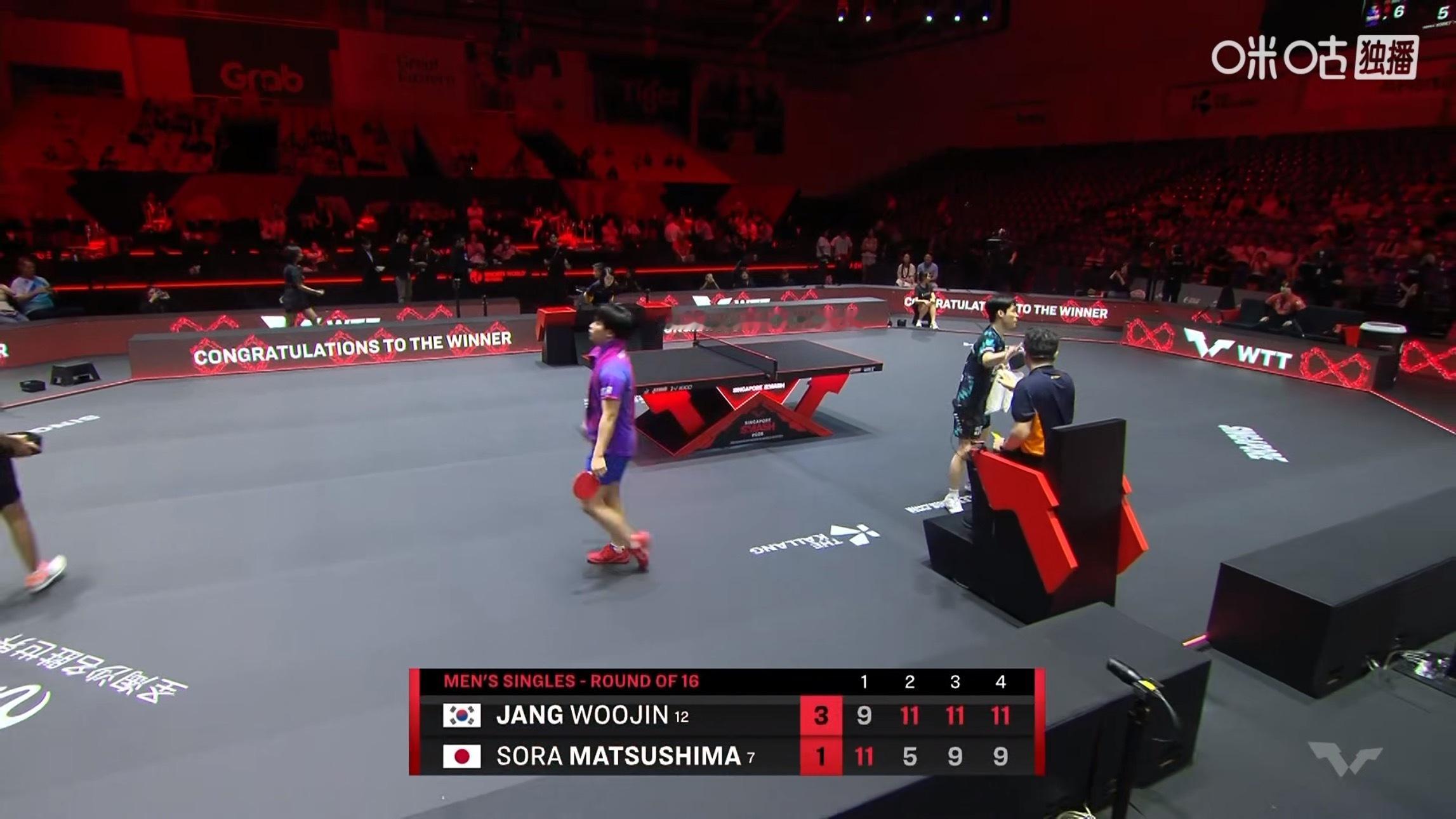 张禹珍3比1松岛辉空(9-11,11-5,11-9,11-9)晋级WTT新加坡大